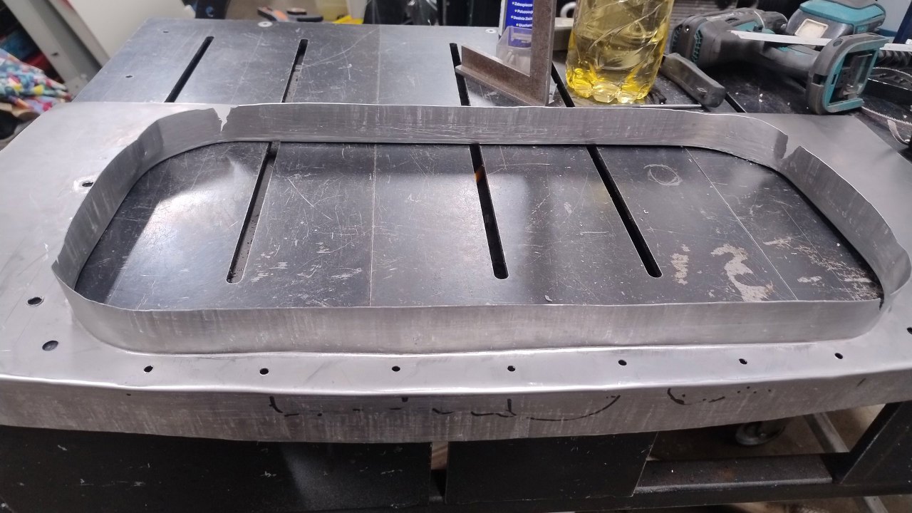 Dlatego następnym krokiem było kurczenie i rozciąganie blachy tak, żeby leżała płasko na stole. Udało się to w końcu osiągnąć. Tak, wzdłuż krawędzi widać kilka rozdarć blachy. W tym momencie syn uznał, że mogłem mieć odrobinę racji w upieraniu się, żeby wyciął to dokładniej :). Nic jednak nie szkodzi, spora część z tego będzie odcięta na koniec.