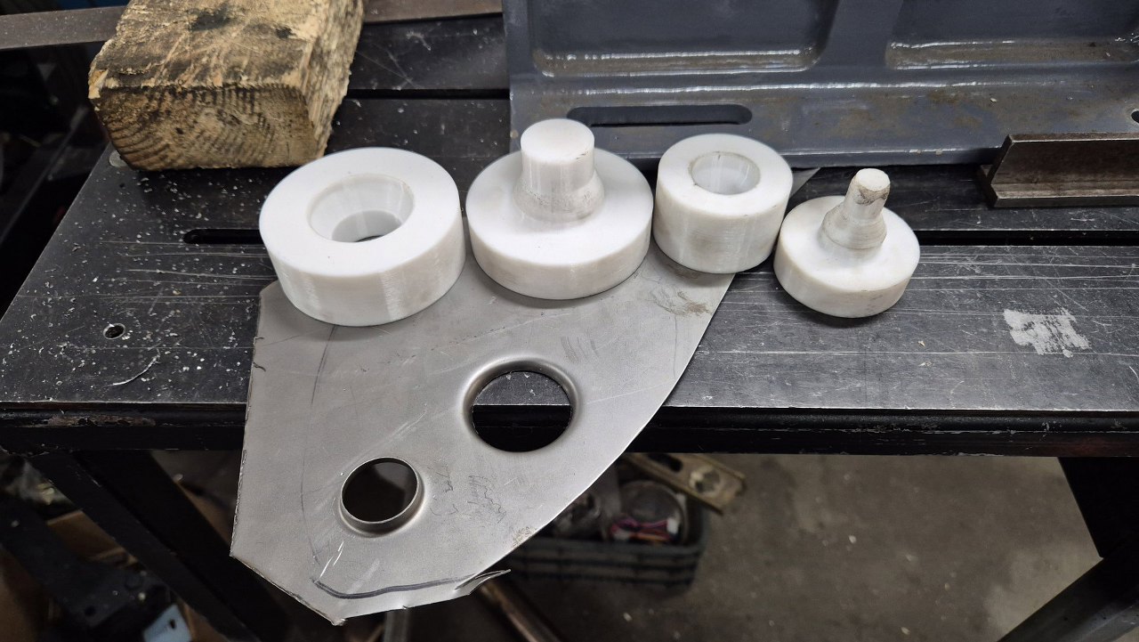 Na podstawie tych pomiarów zaprojektowaliśmy tłoczniki do otworów. Nie chciało mi się tego toczyć, więc spróbowałem też to wydrukować. Daje to radę, wytrzyma na pewno mniej niż stal, ale za to nie trzeba stać przy tokarce. Testowe przetłoczenia wyglądają ładnie.