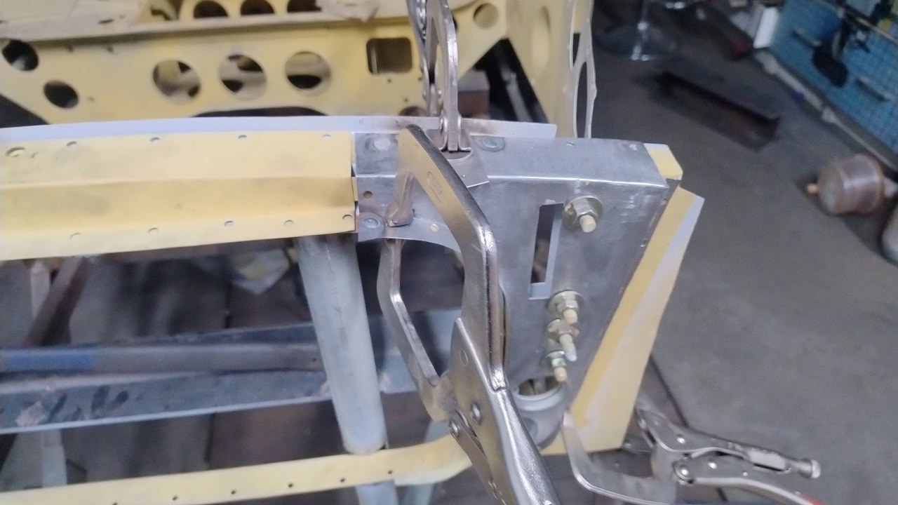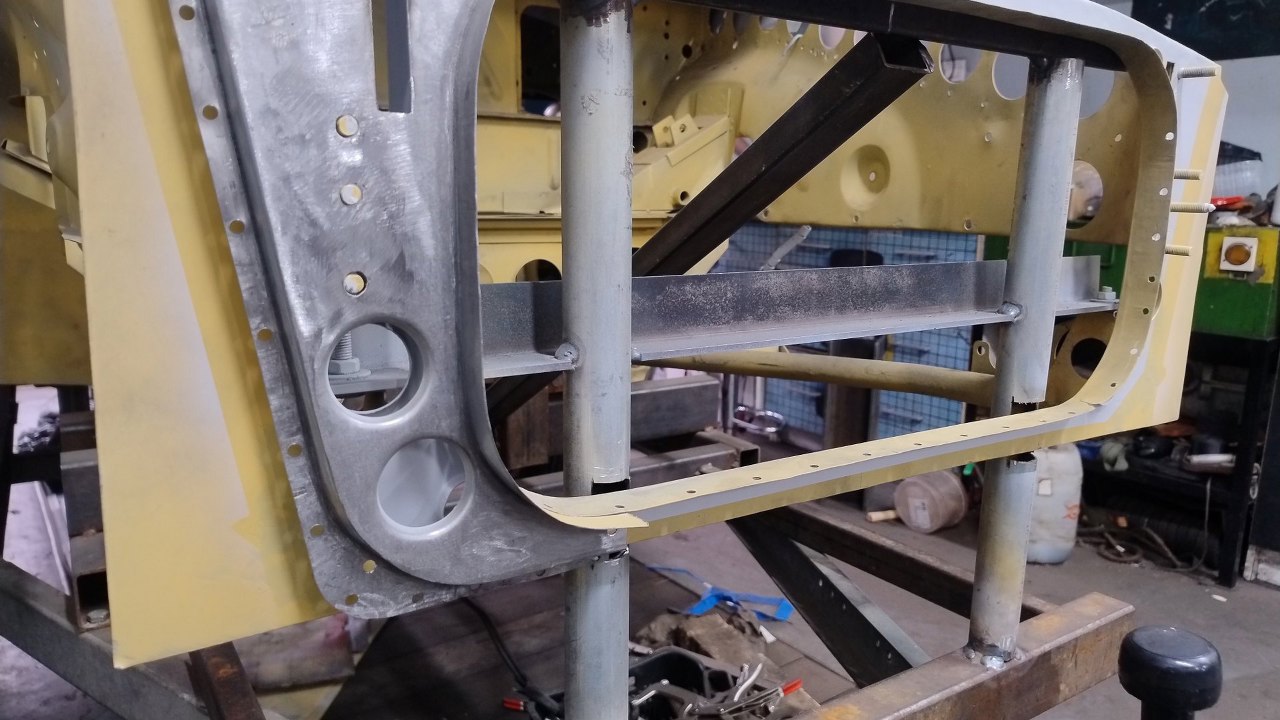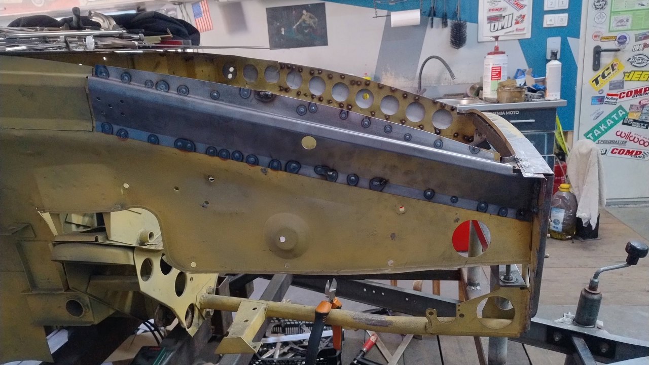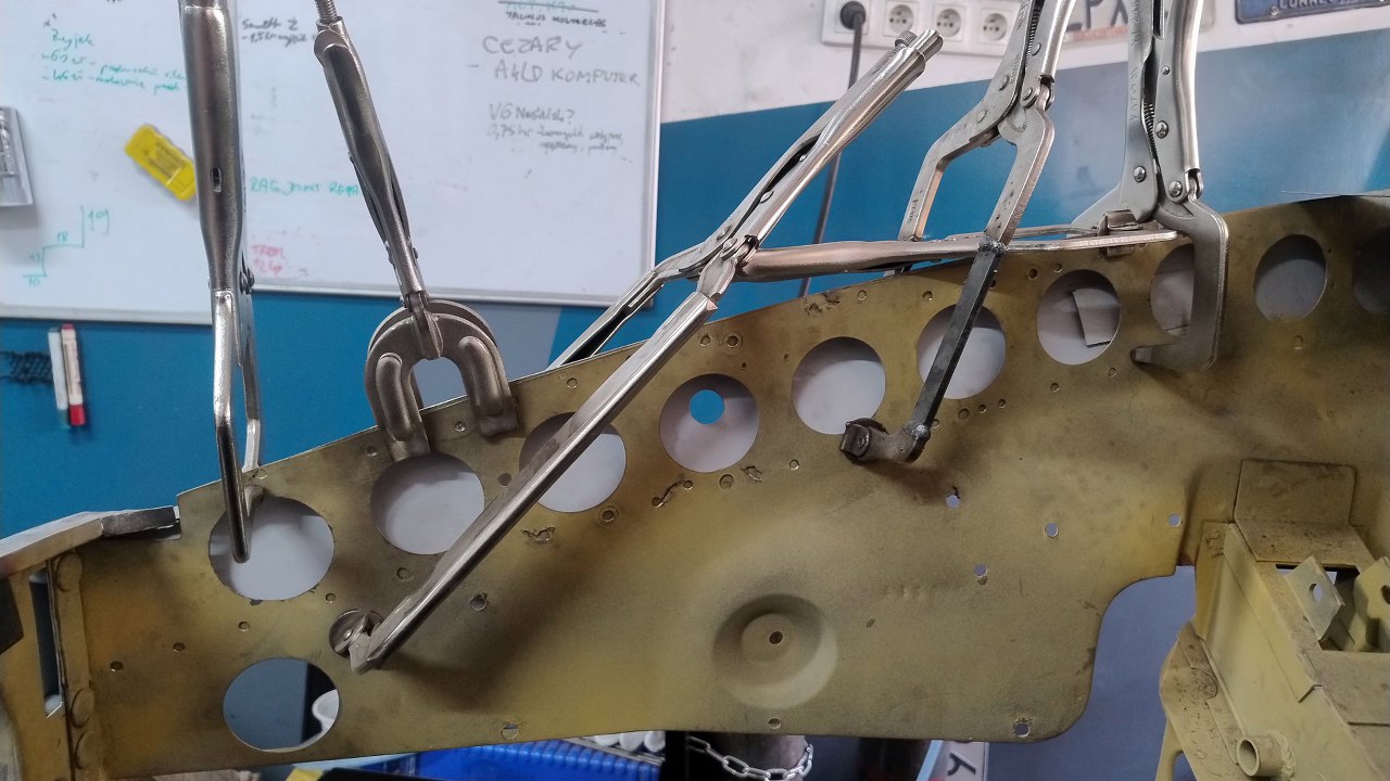 Tu też nowe wzmocnienie zostało złapane ściskami. Przymierzanie tego nie jest proste, bo mamy odmierzone w jakie miejsce to powinno trafić. W końcu na to przykręcane będą błotniki zewnętrzne.