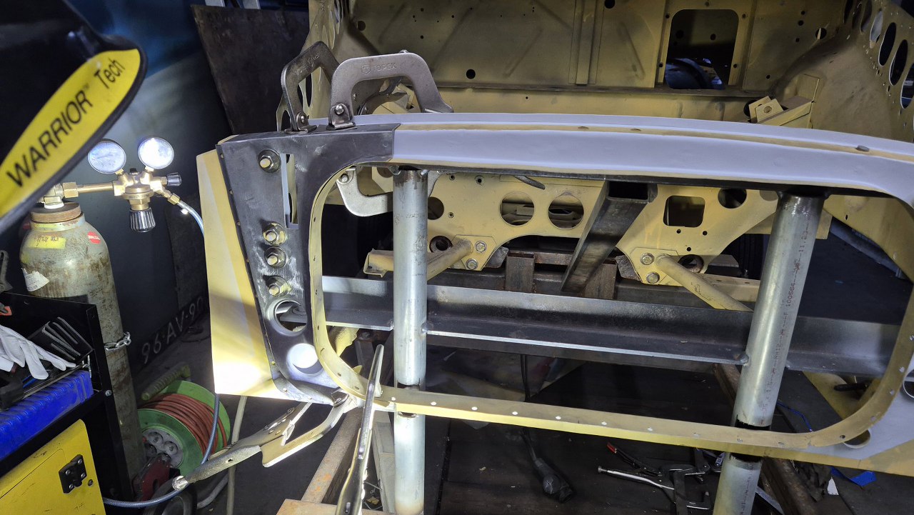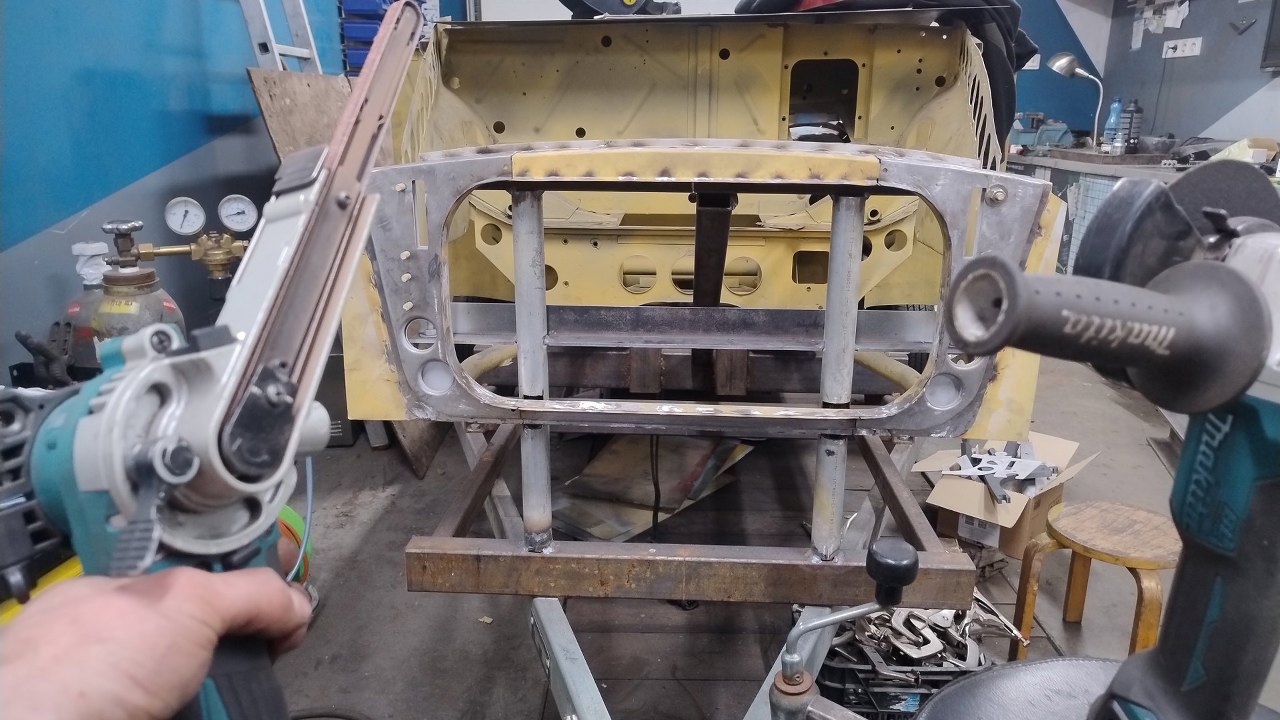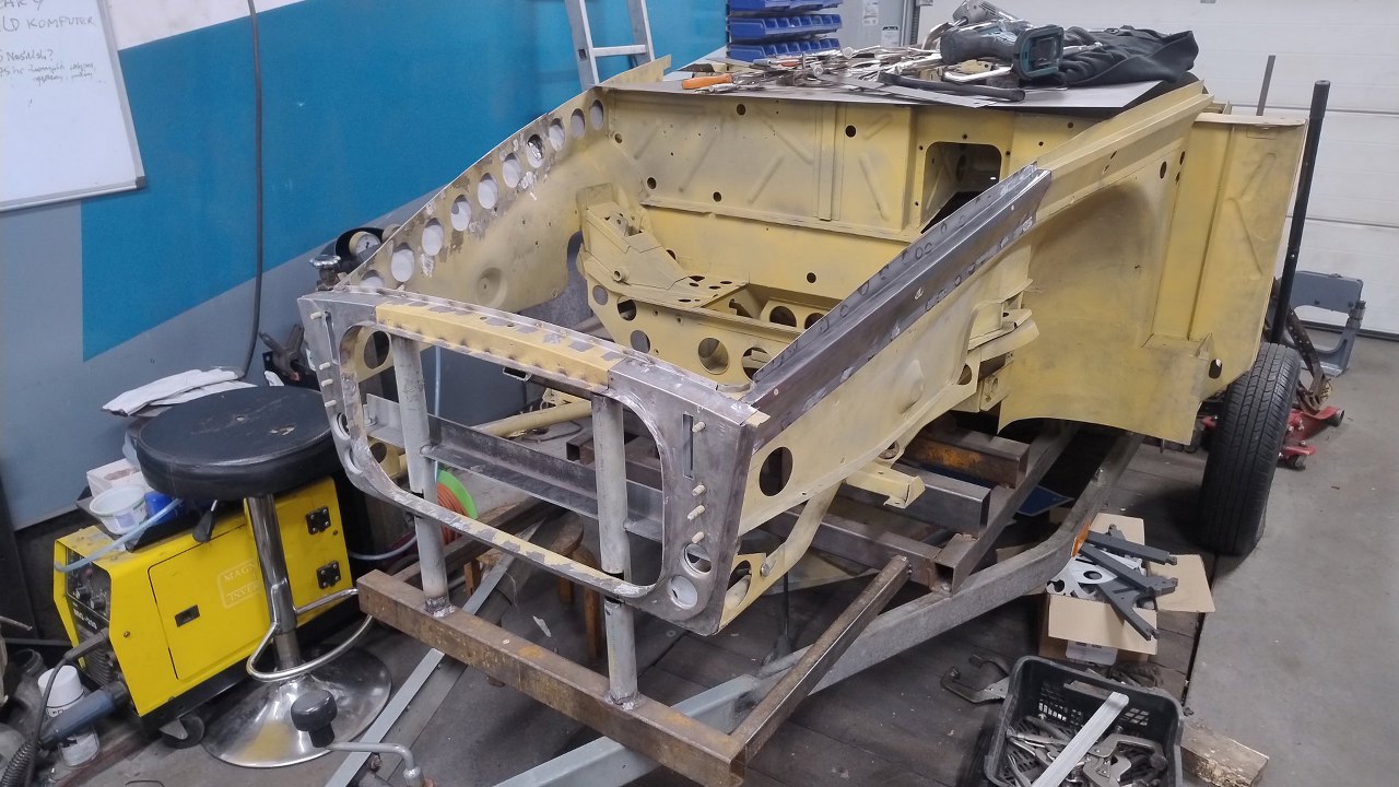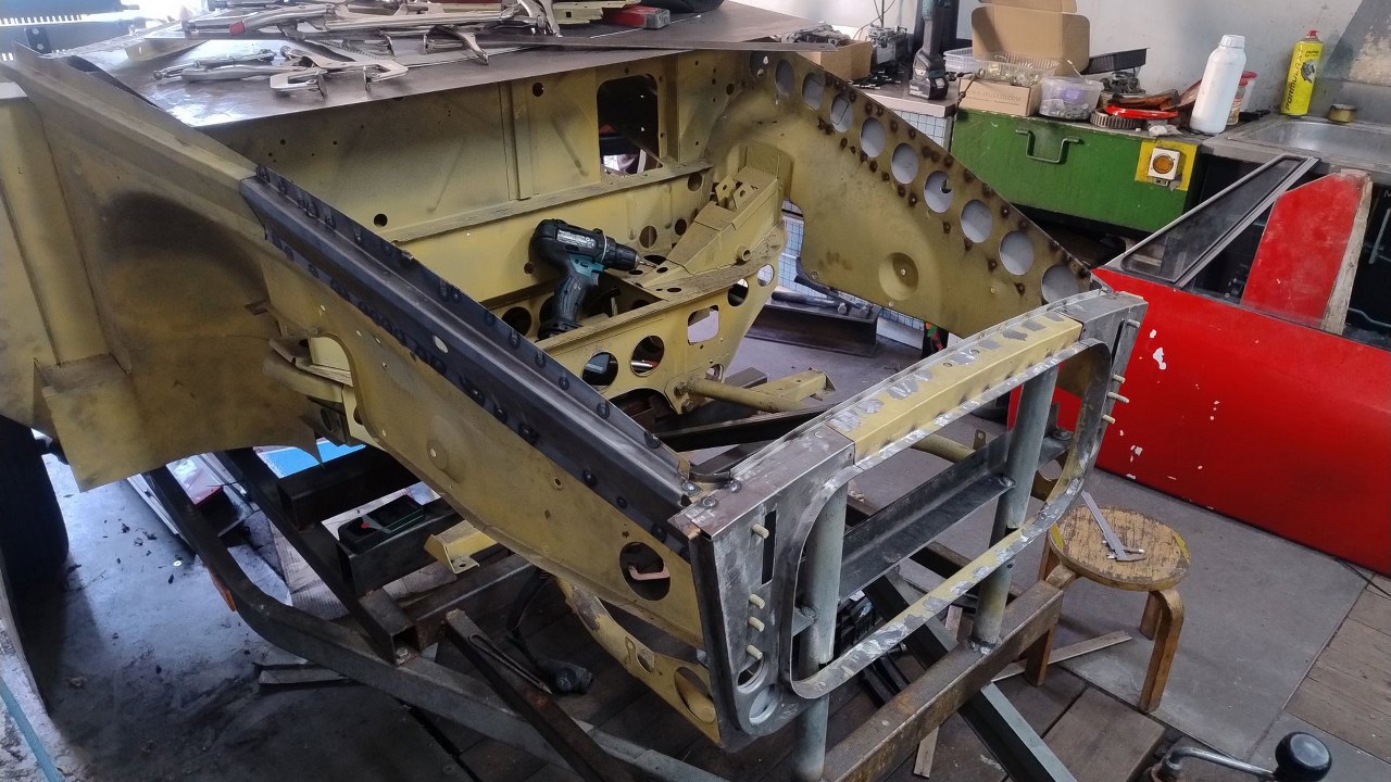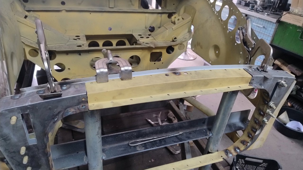 Po wyschnięciu podkładów Maciek zaczyna składać resztę przodu. Blachy boczne tu są na początku nakładania na śruby. Wszędzie są już zrobione otworki na spawy.