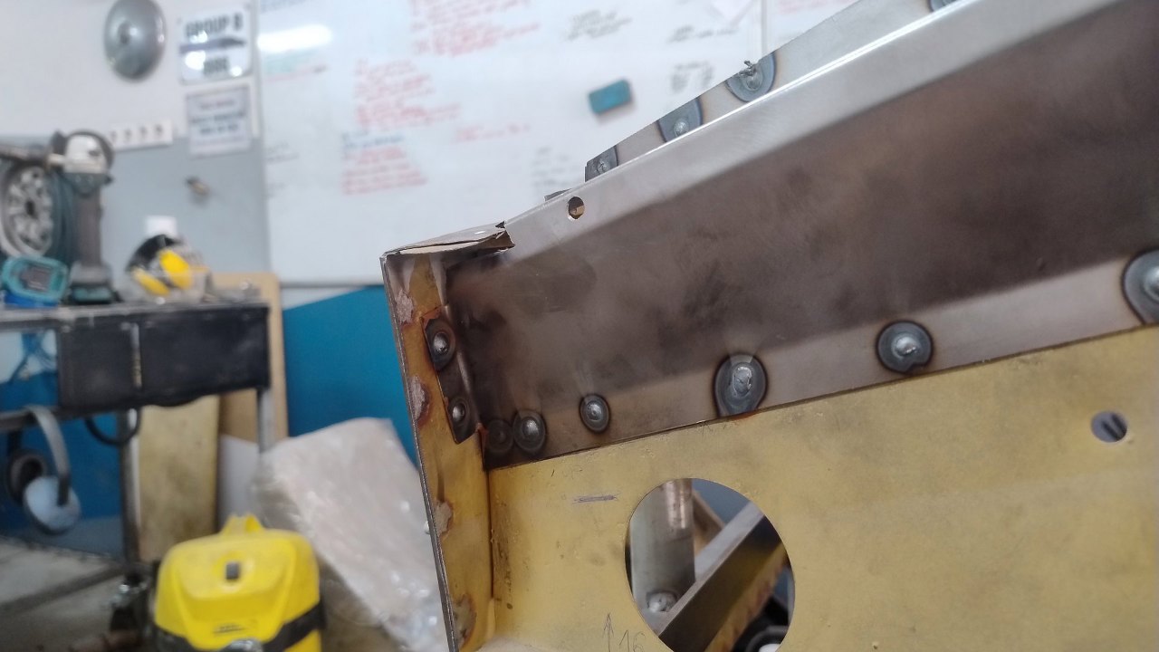 Drugie wzmocnienie, po prawej, ciężej odchodziło, więc niektóre zgrzewy lekko naderwały blachę. Te naderwania zostały nacięte i zostaną zaspawane.