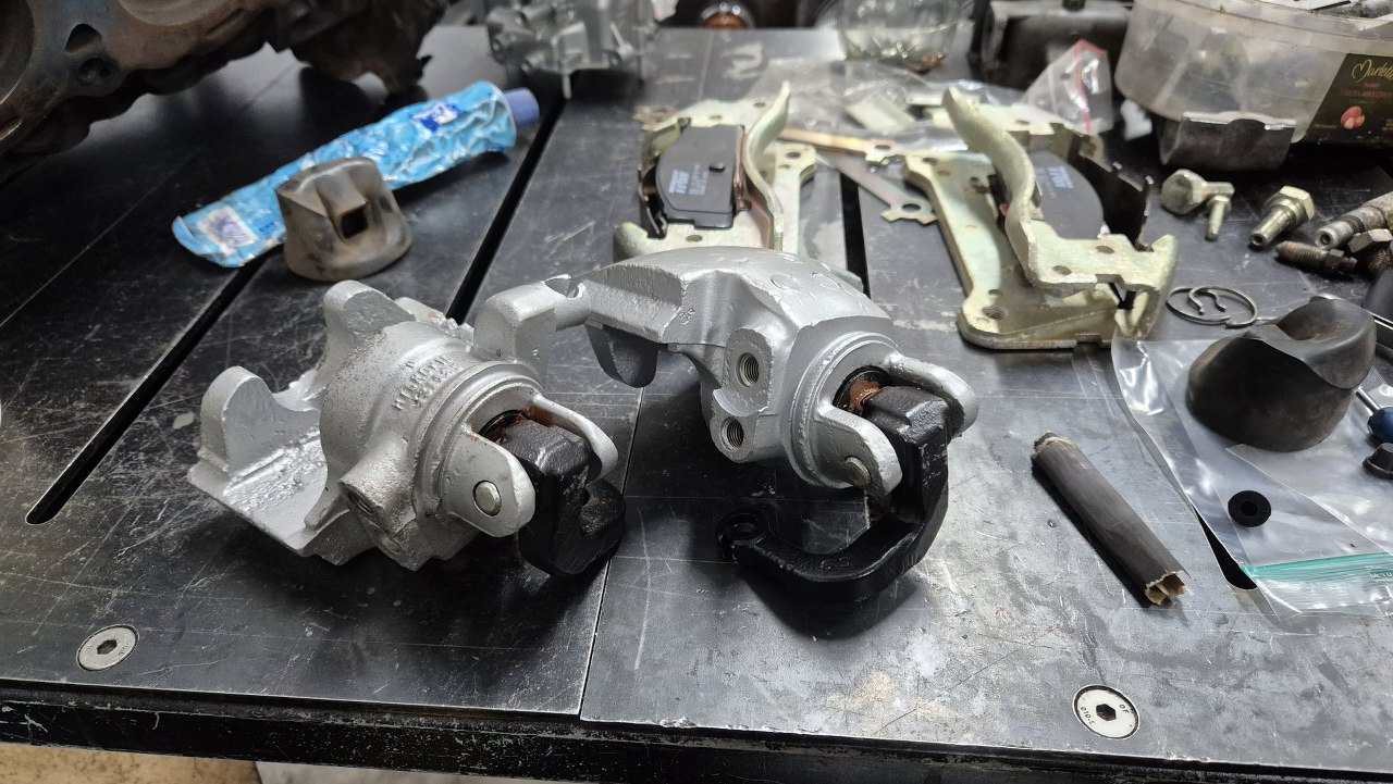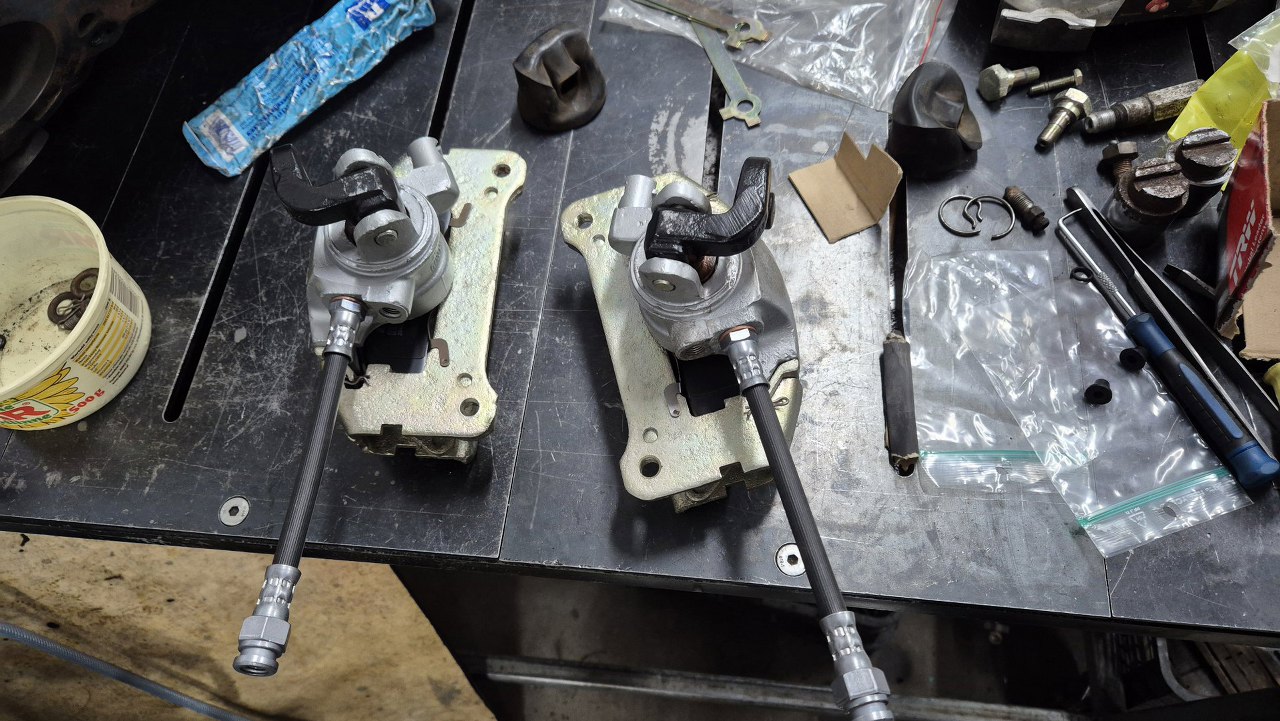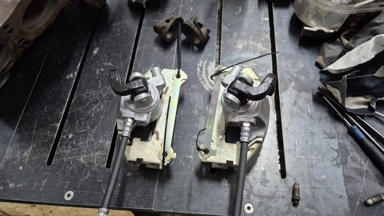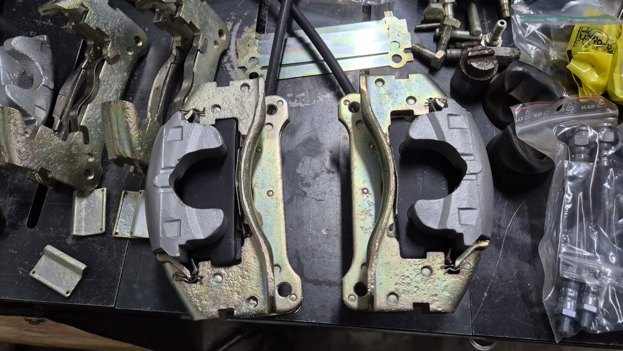 Zaczynam od retrospekcji, żeby pokazać jak wyglądały przed zrobieniem. Tu są tylne zaciski, z dźwigniami hamulca postojowego.