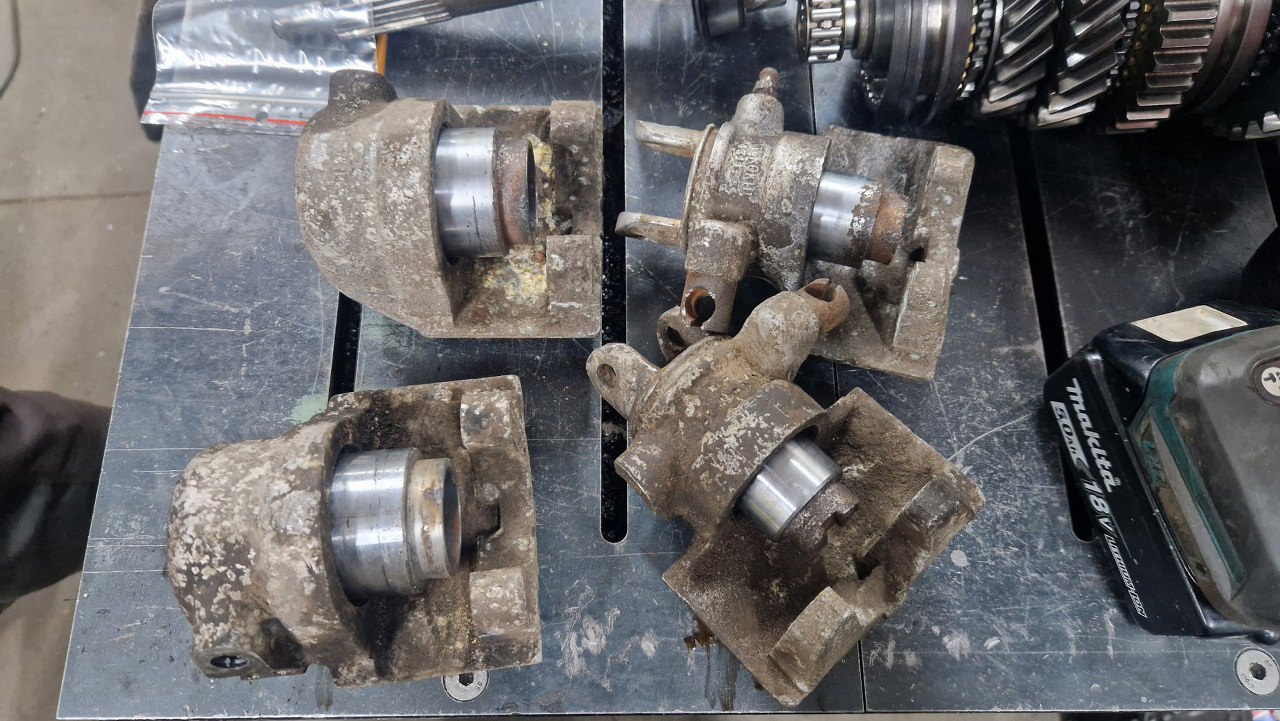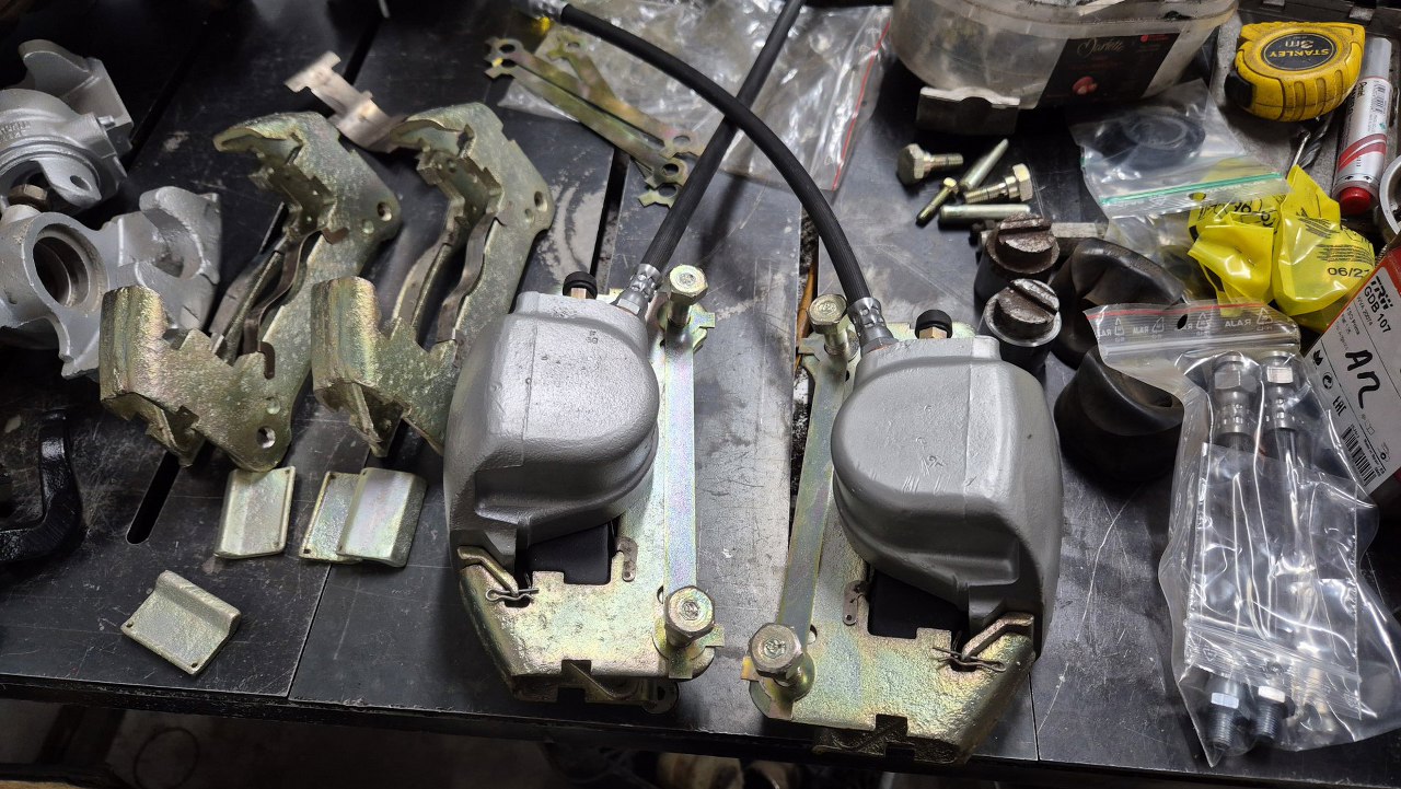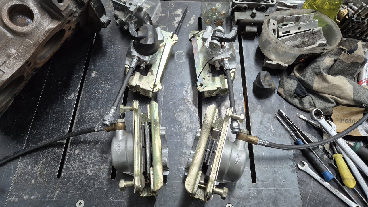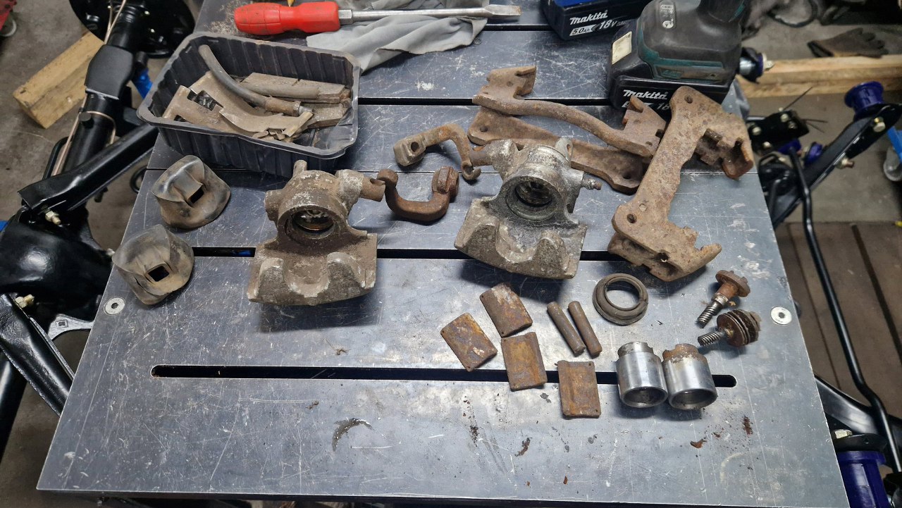 Zaczynam od retrospekcji, żeby pokazać jak wyglądały przed zrobieniem. Tu są tylne zaciski, z dźwigniami hamulca postojowego.