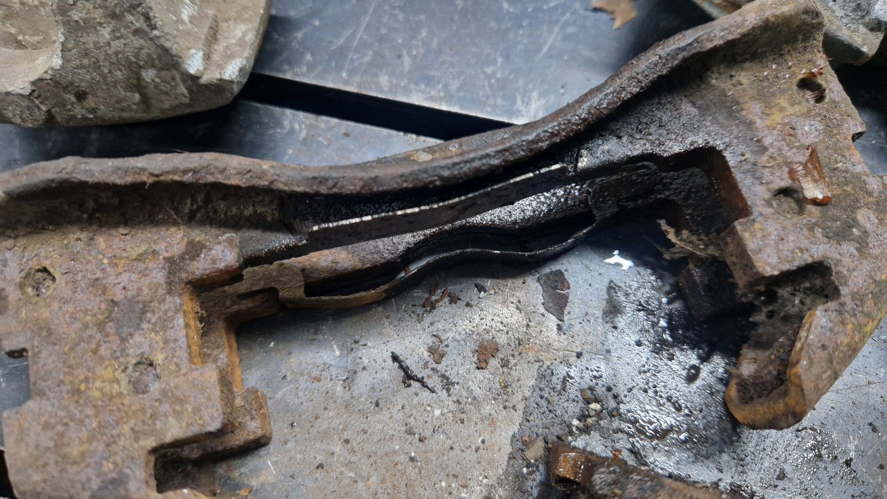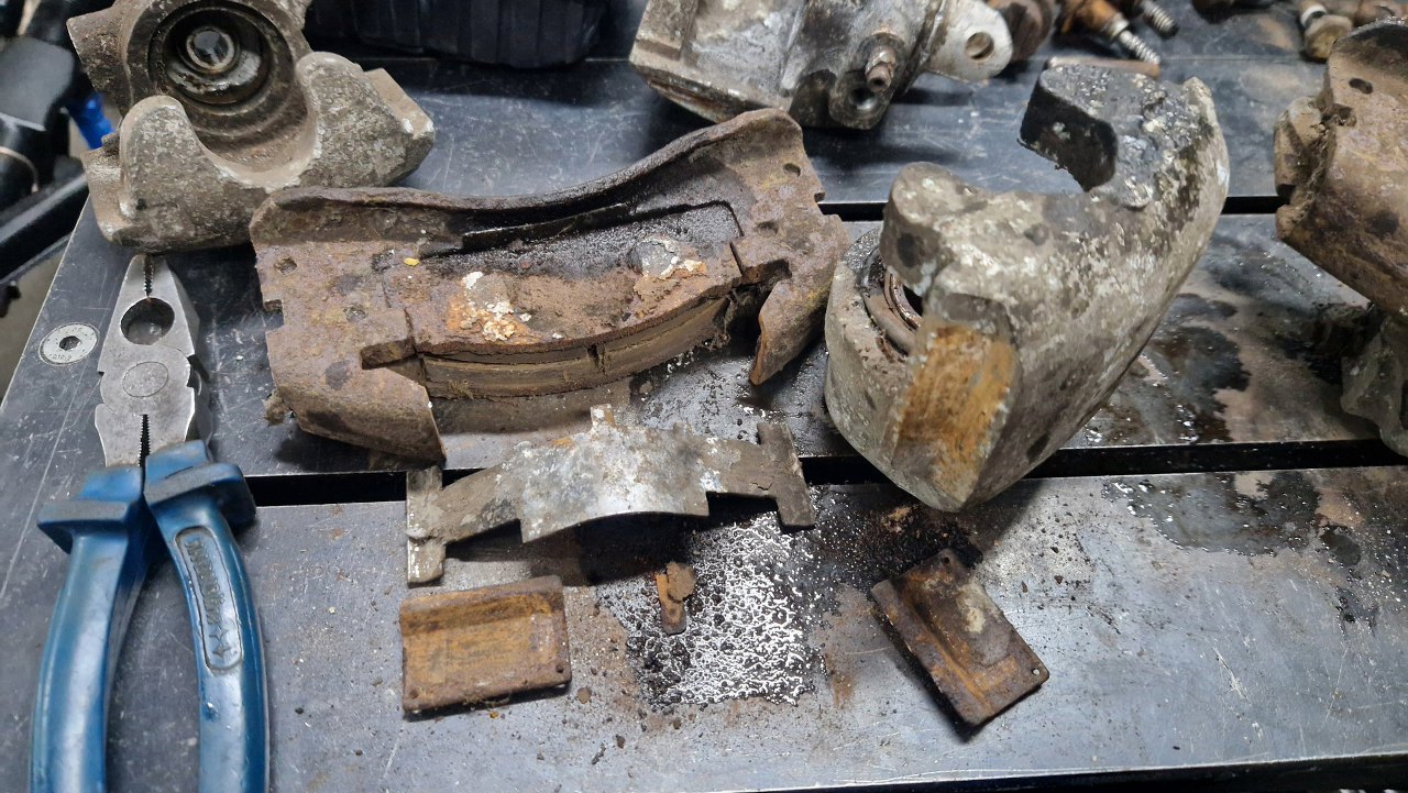 Po lewej i ciut wyżej od tłoczków są piny trzymające ramiona hamulca postojowego w zacisku. Te ramiona widać pomiędzy zaciskami. Od strony ramion w zacisk wkręcone są mechanizmy hamulca ręcznego, te po prawej od tłoczków. Mają one sprężyny talerzowe, ale tak mocno zapyziałe, że początkowo nie wiedziałem nawet co to jest. Ten element wyżej miał je wszystkie sklejone w jedną rdzawą podkładkę.