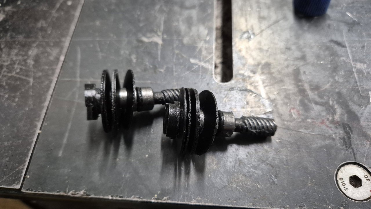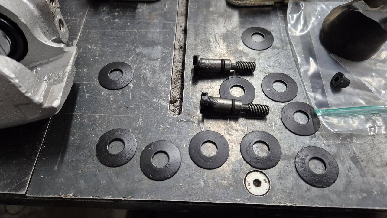 Te "śruby" wkładane są od drugiej strony zacisku. Założyłem na nie nowe oringi uszczelniające. Myślałem o wymianie tych sprężyn talerzowych, ale po odrdzewieniu jeszcze się trzymają, więc damy im szansę.
