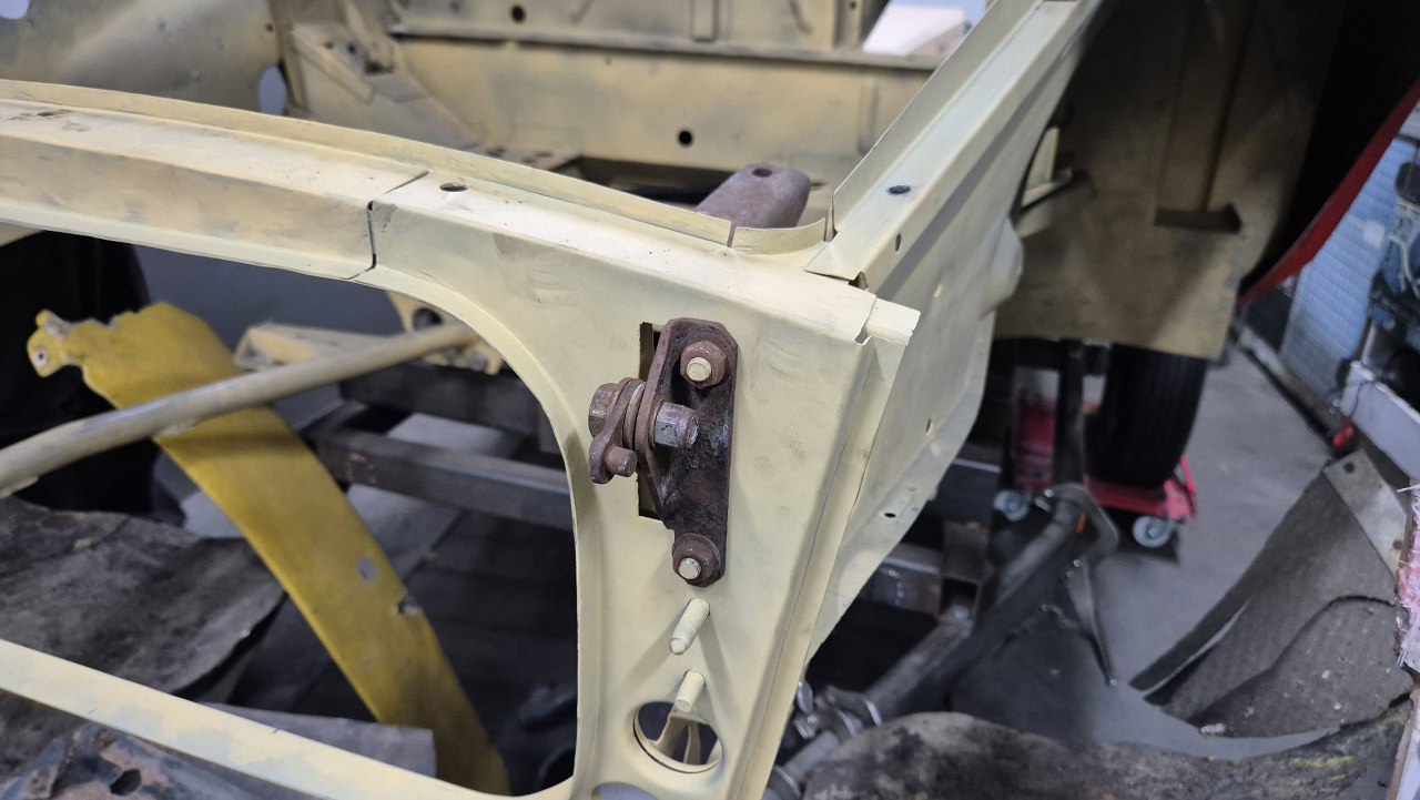 Błotniki nie mają jeszcze wszystkich otworów mocujących, ale łapiemy je aby tylko sie trzymały. Ustawiliśmy ramę szyby przedniej w miejscu arbitralnie uznanym przez nas za właściwe. Następnie przykręciliśmy i wyregulowaliśmy drzwi, a do nich błotniki.
