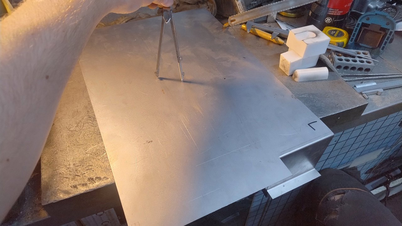 Maciej zaczyna więc prace nad blachami tyłu. Tu mieliśmy wcześniej wygięte (jeszcze na etapie zamawiania paneli podłogi) blachy przeznaczone na reperaturki tych zewnętrznych kaset. Zaczynamy od dokładnego pomierzenia starych otworów i ich położenia względem punktów odniesienia wspólnych dla starej części i reperaturki. Po ich narysowaniu w CADzie, możemy przenieść wymiary na nową część i weryfikować jedne wymiary z drugimi.