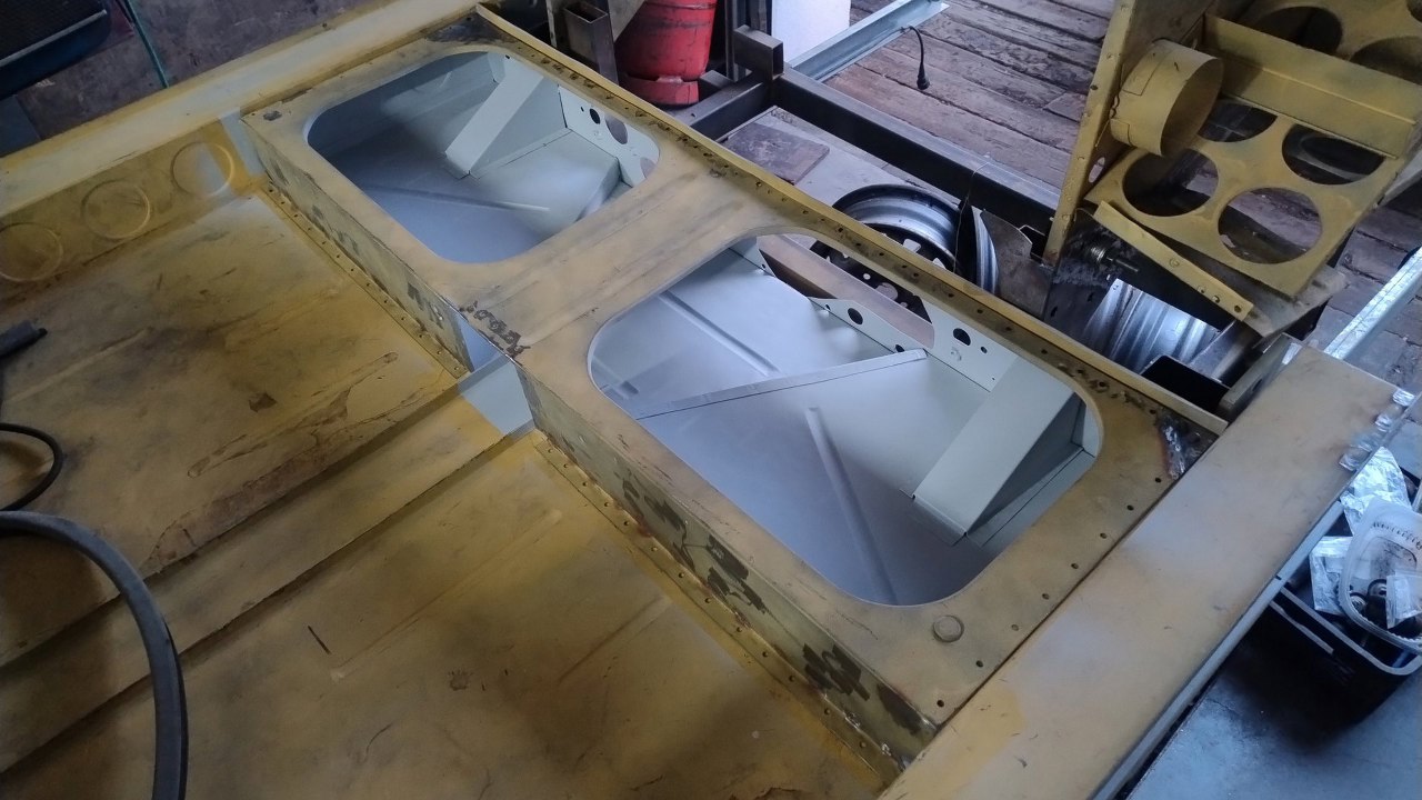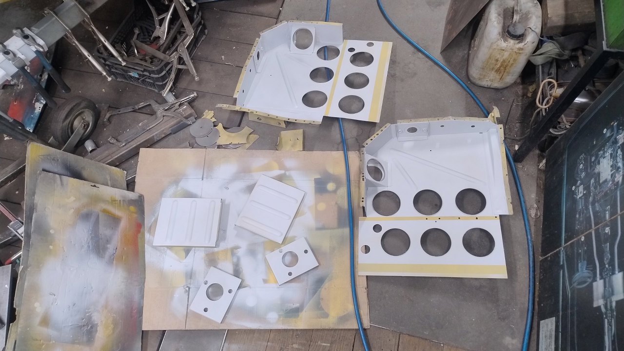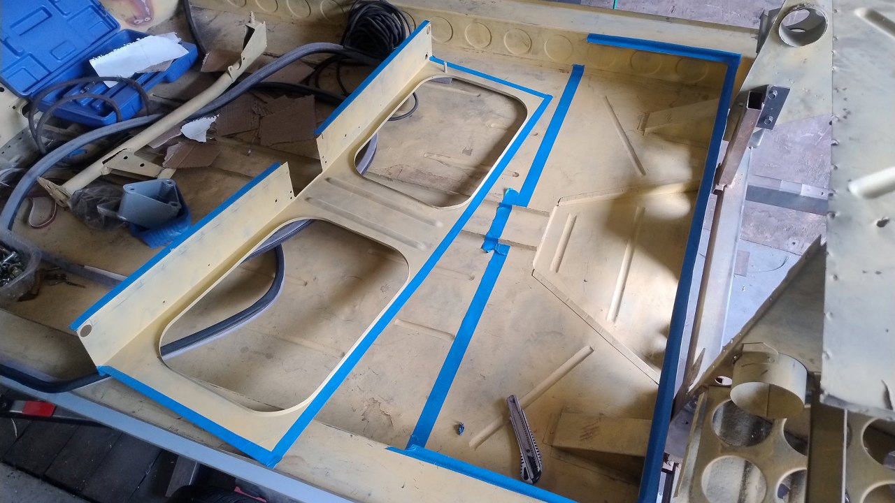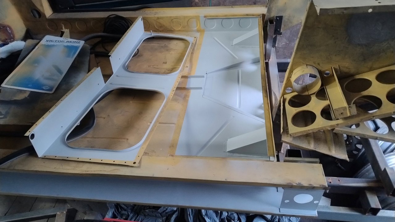Maciej też dokończył naprawianie podstawy siedziska tylnej kanapy, wyznaczył jego dokładne położenie na podłodze i zabezpieczył i te części do pomalowania podkładem.