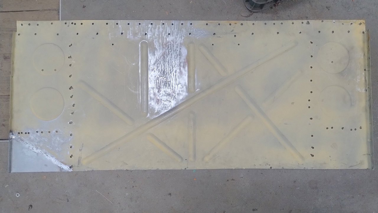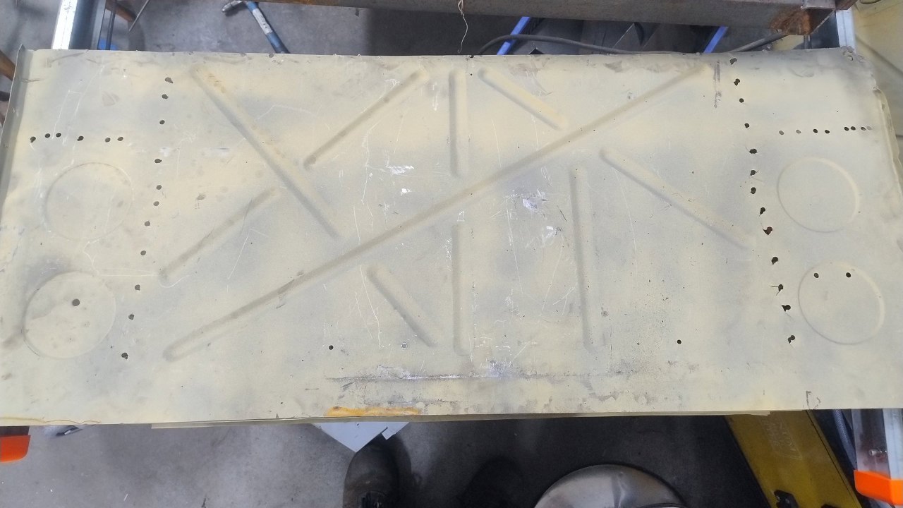 Zabaw z blachą ciąg dalszy, ale gdyby cię to nie interesowało, to przecież byś nie czytał, prawda? Tym razem Maciek zabrał się za plecy kabiny, czyli gródź między kabiną a komorą silnika. To jest oryginalny element, który nie jest co prawda gotowy do użycia, ale chyba warto go uratować. W dolnej części zdjęcia (która akurat jest górą tej części) widać poziomą linię. Jest to odciśnięte wzmocnienie, które jest z drugiej strony.