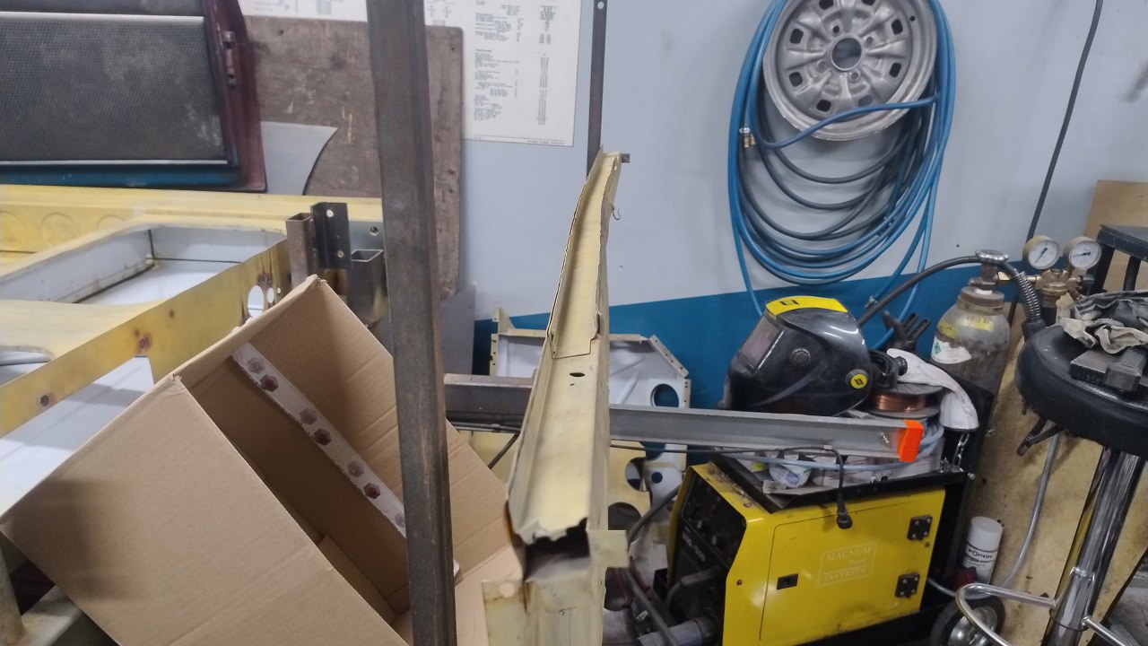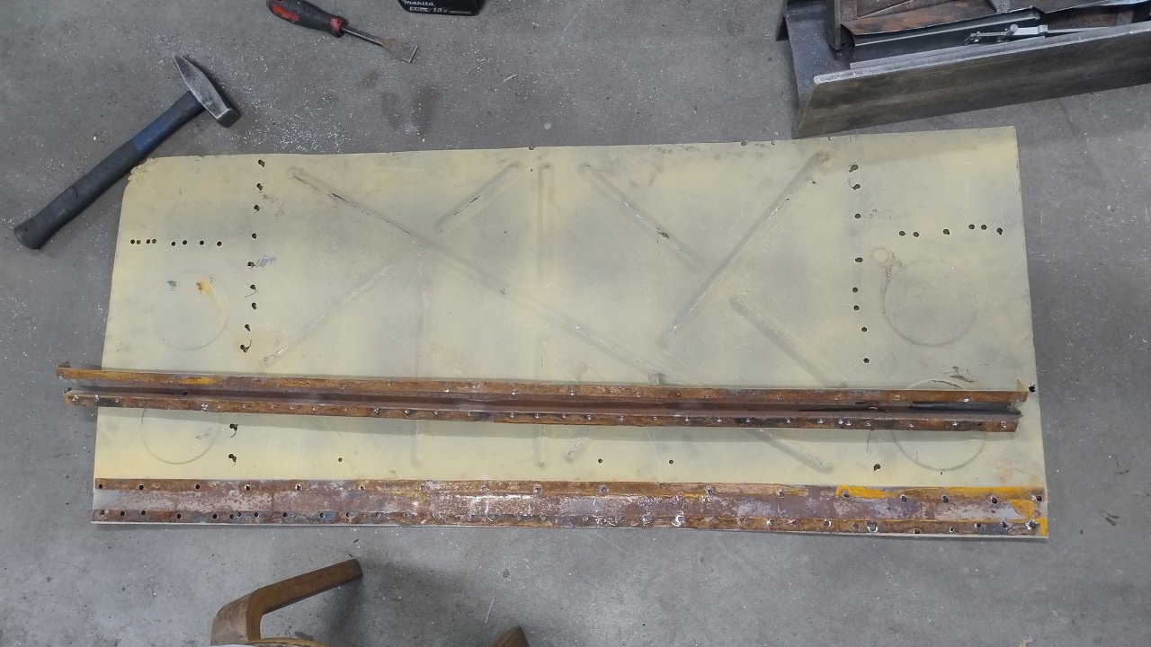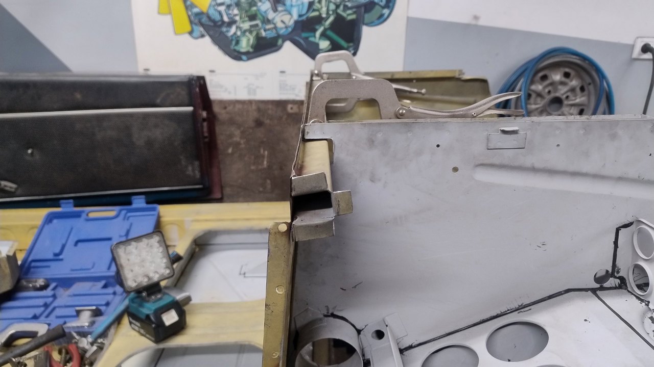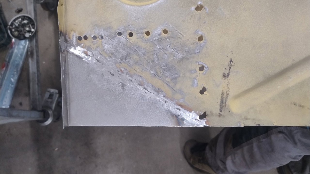 Dwie blachy, ta dolna pionowa i górna lekko pochylona, powinny być połączone. Fabrycznie ledwo to pasowało do siebie, bo ślady zgrzewów są na samej krawędzi górnej blachy. Tu się nie zeszło...