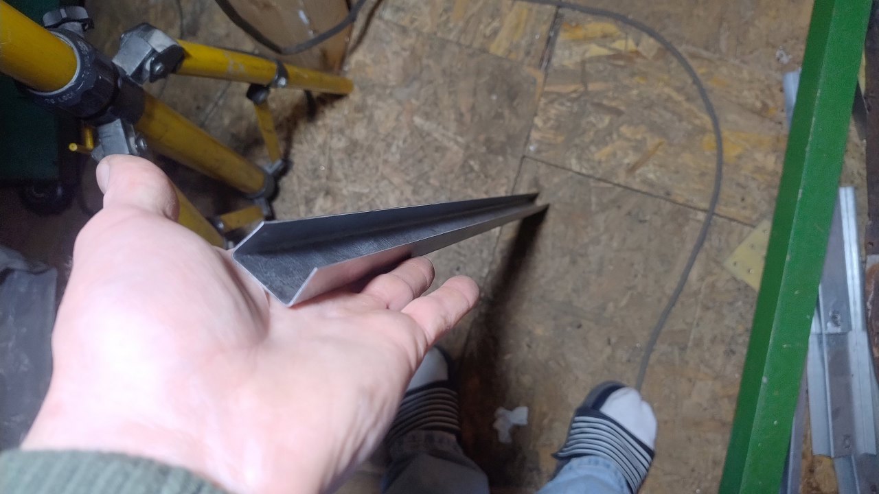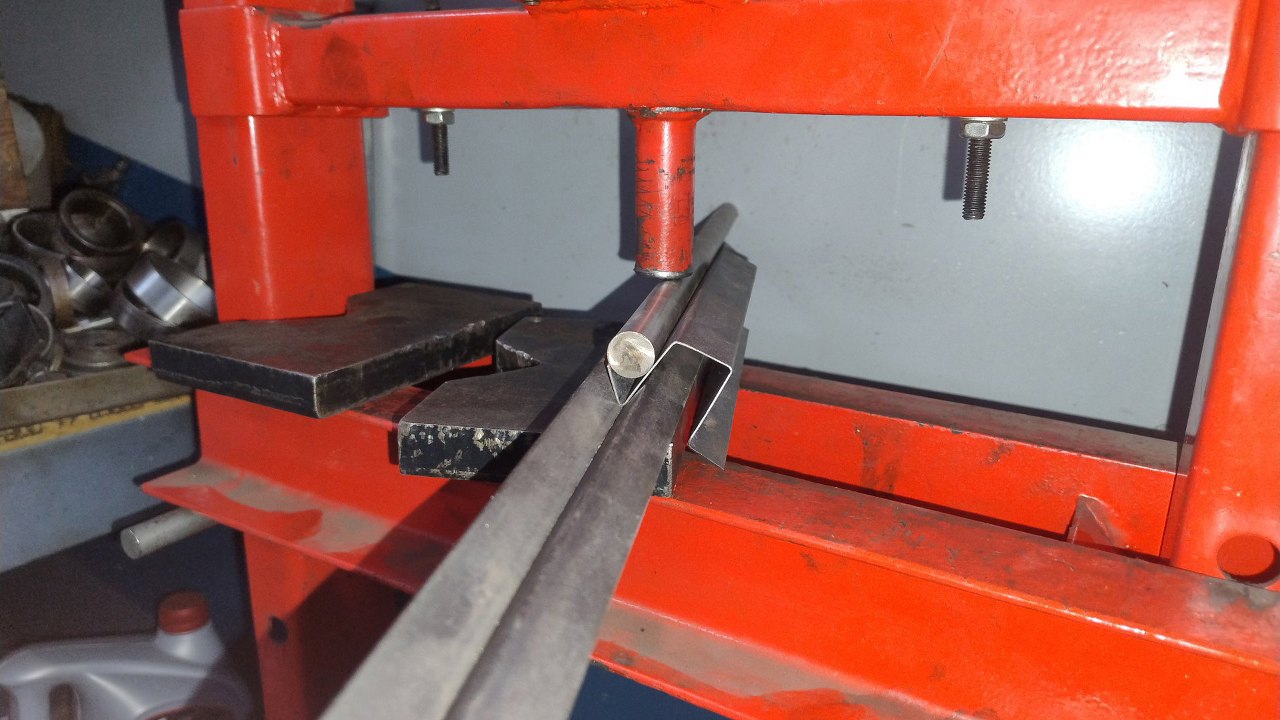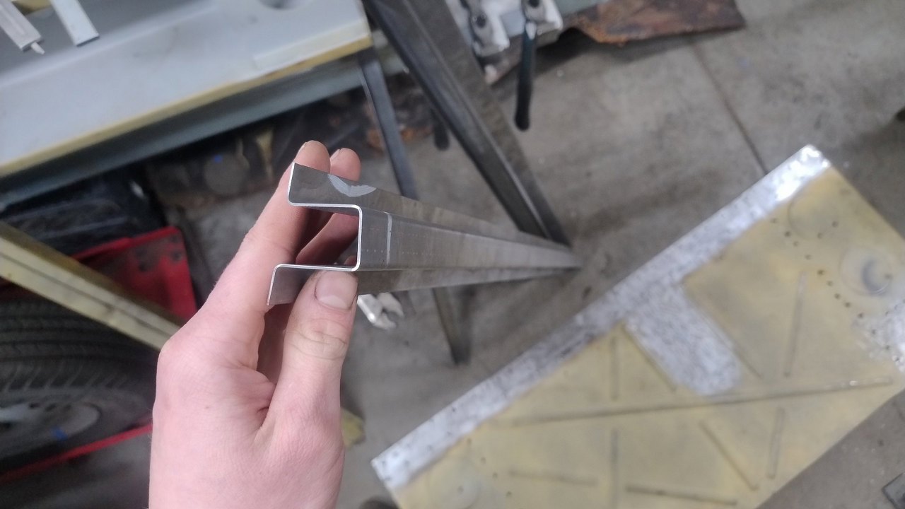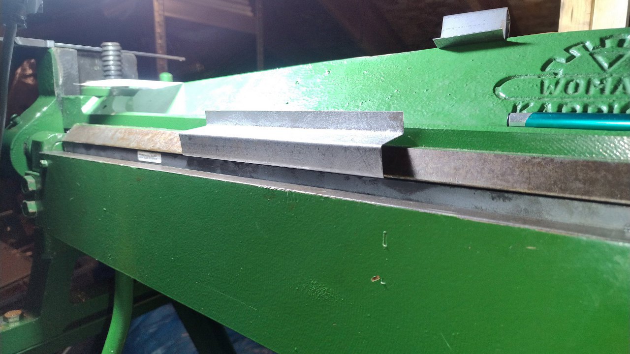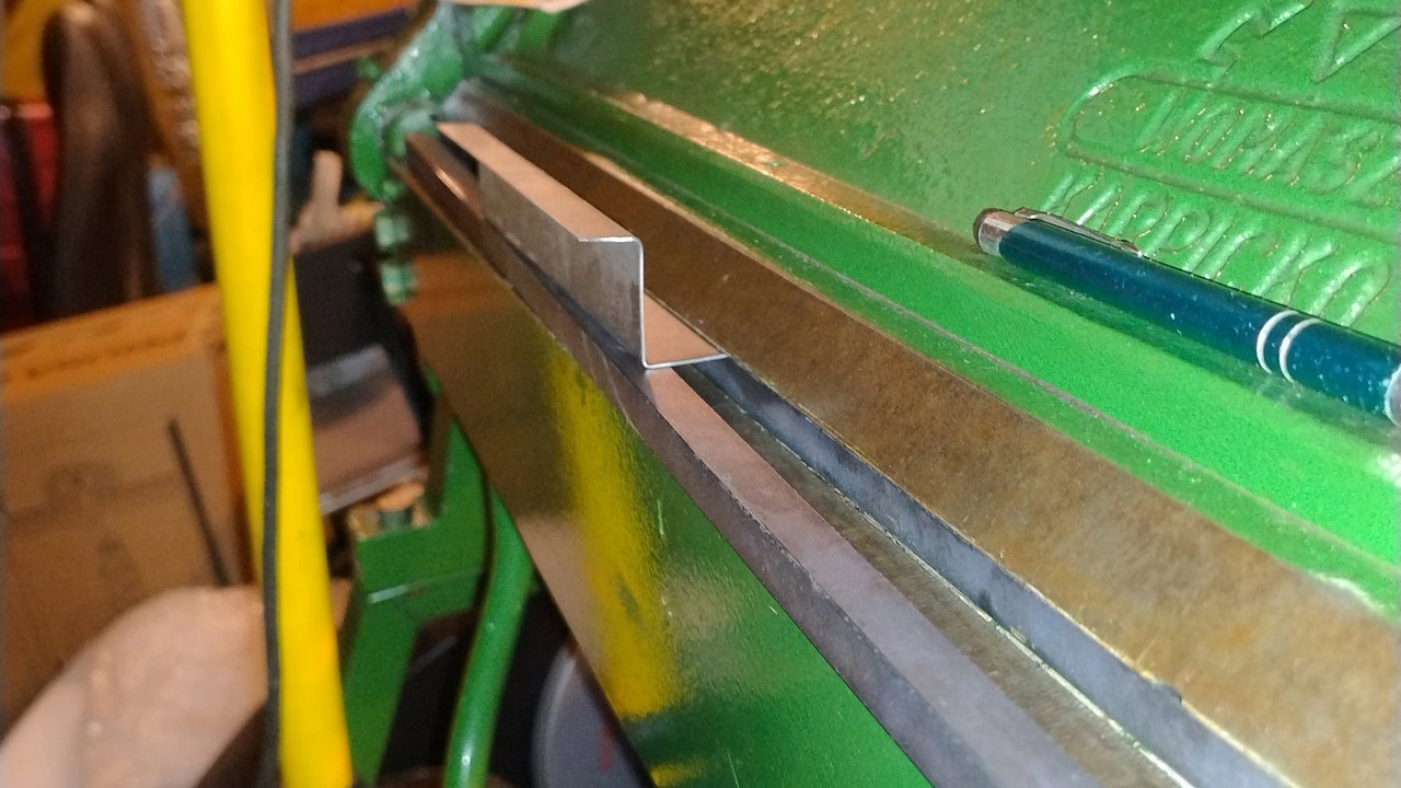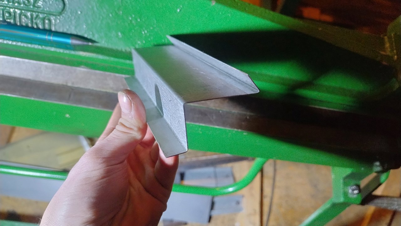 Profil wzmacniający jest nieco trudniejszy, bo ma kształt omegi, a to jż trudno w naszej giętarce wygiąć. Trzeba zacząć od czegoś takiego. Jedna krawędź specjalnie jest wygięta poza kąt 90 stopni, żeby się zmieścić w giętarce z następnym gięciem.