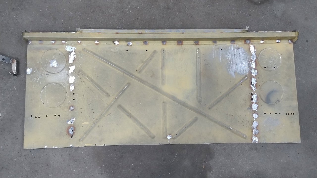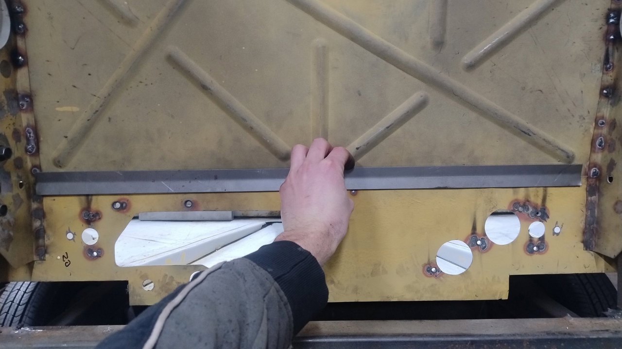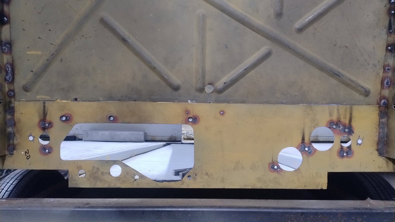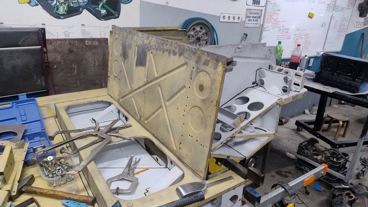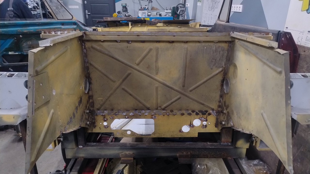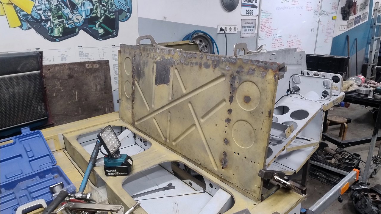 Potem spawy zostały oszlifowane. W bocznych częściach będą jeszcze dokładane wzmocnienia wewnątrz progów, które oryginalnie wychodziły w górę tej pochyłej blachy, więc tu jeszcze blachy zostaną połączone.