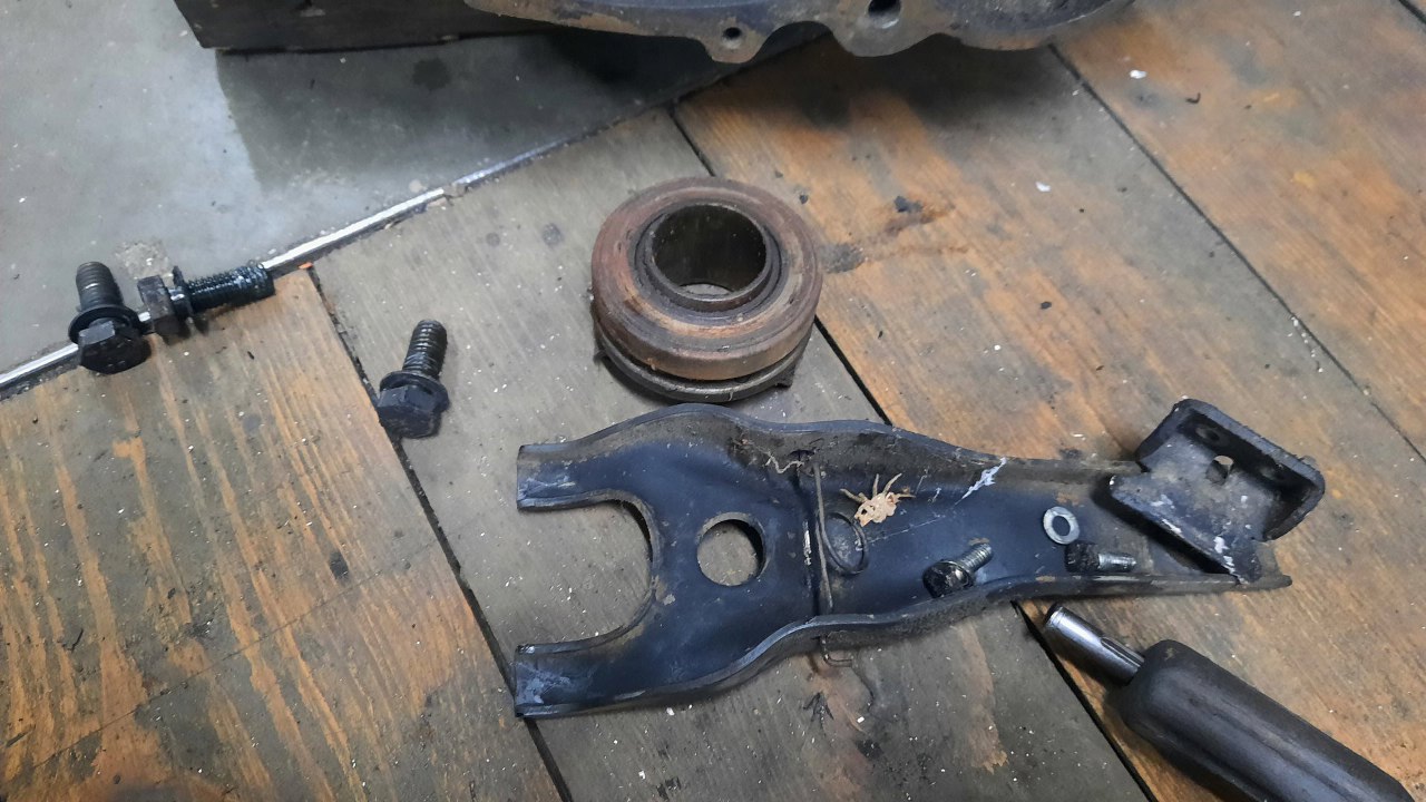 Zdjąłem łapę sprzęgła i łożysko. Razem z łapą odkręciłem jej mocowanie do dzwonu. Późniejsze skrzynie miały już inny system mocowania.
