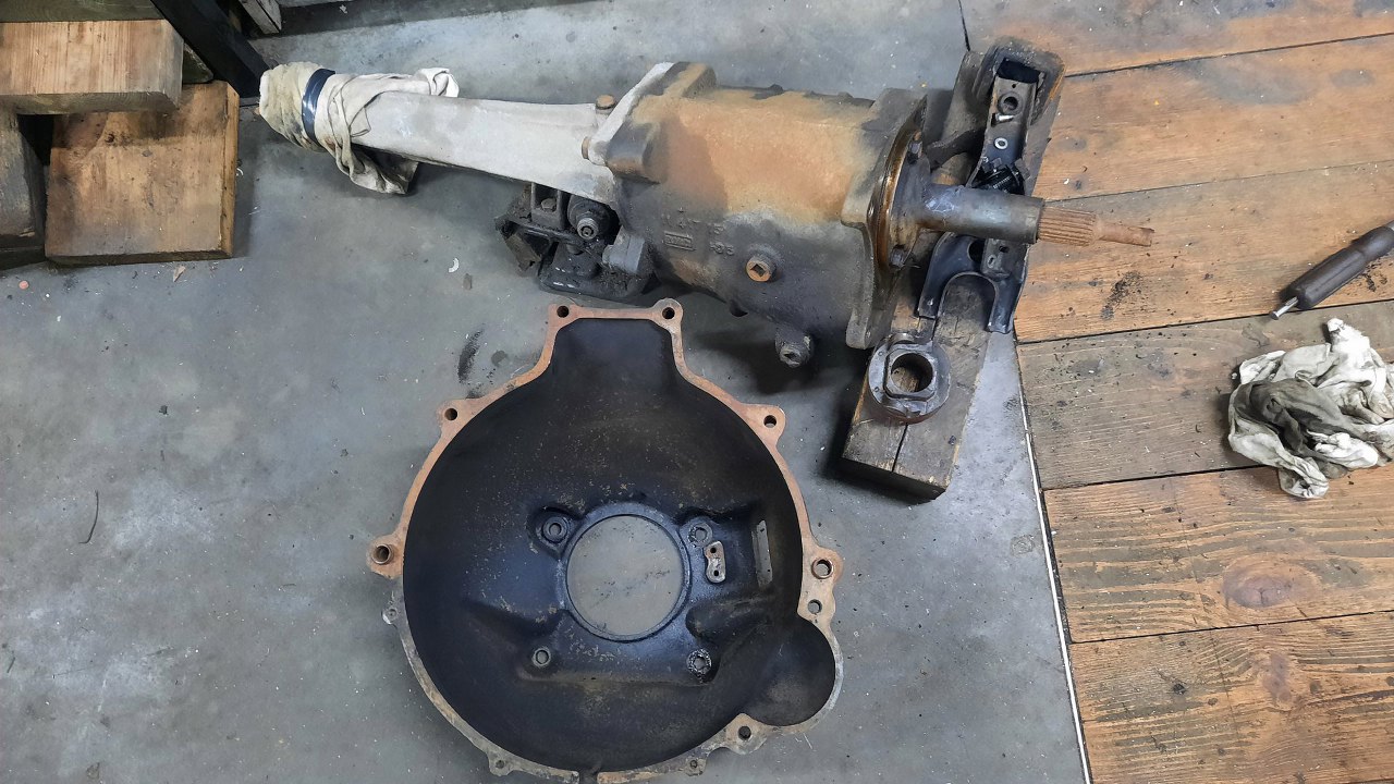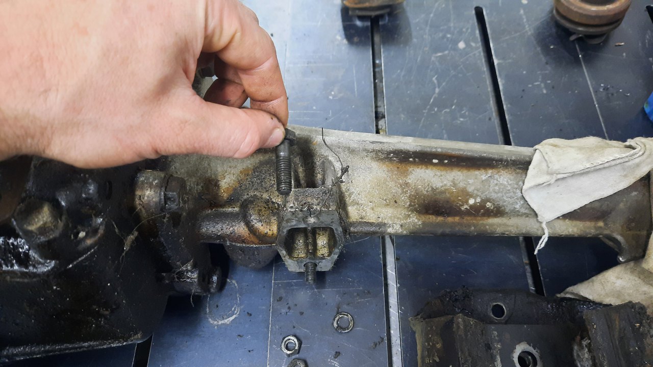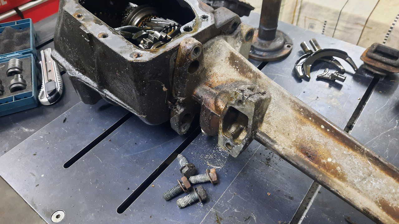 Odkręciłem ogon skrzyni od obudowy. Jest przykręcony na cztery śruby, identyczne jak te, które mocowały dzwon. W późniejszych skrzyniach te śruby się już nieco różnią.