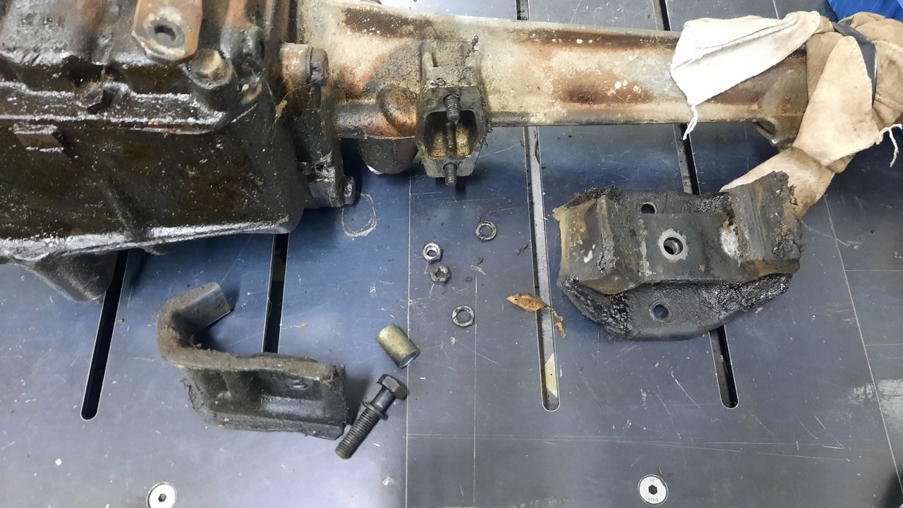 Odkręciłem poduszkę skrzyni. Guma jest we w miarę dobrym stanie. Nie mogłem znaleźć reprodukcji, więc póki co chyba spróbujemy, czy będzie się trzymała.