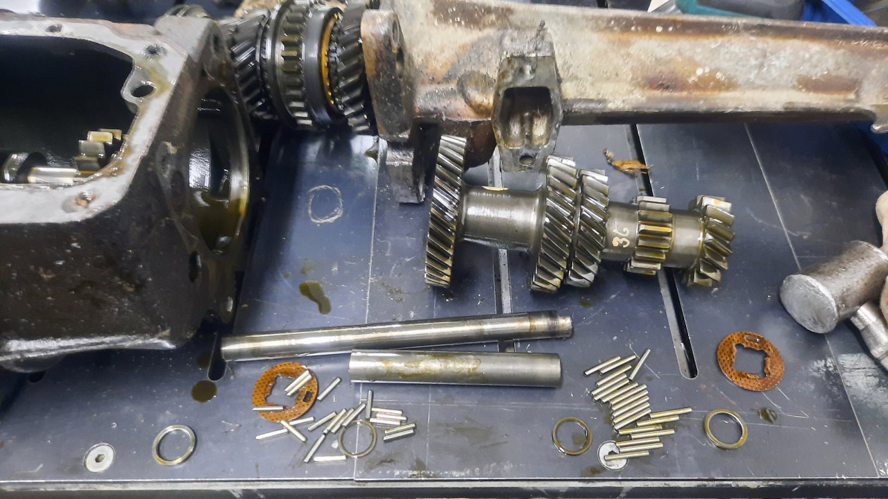 Potem poszło już szybko - wyjąłem ze skrzyni ogon z częścią przekładni, z przodu wałek sprzęgłowy, a potem ze środka choinkę. Z choinki wyjąłem wszystkie igiełki. To one łożyskują choinkę na ośce. W środku są jeszcze podkładki i tuleja dystansowa. Na końcach, pomiędzy choinką a obudową, są panewki oporowe.