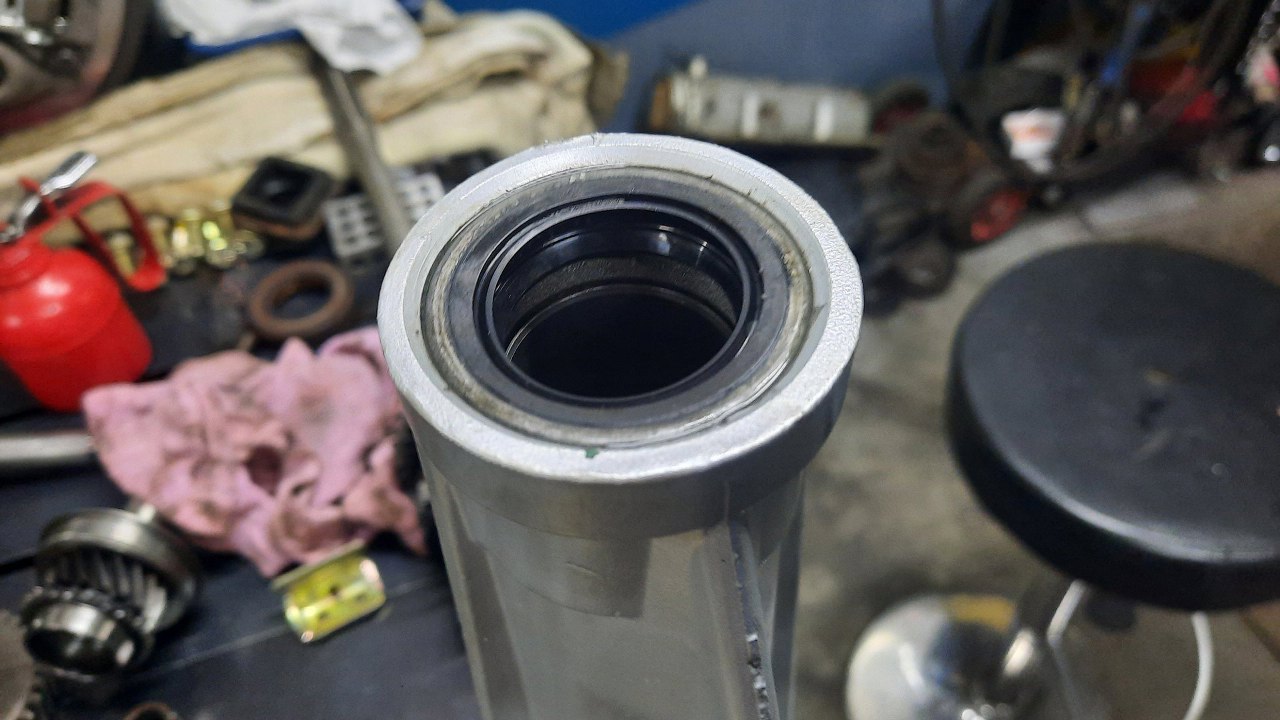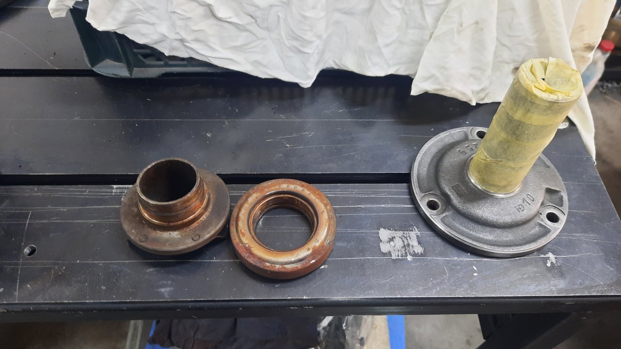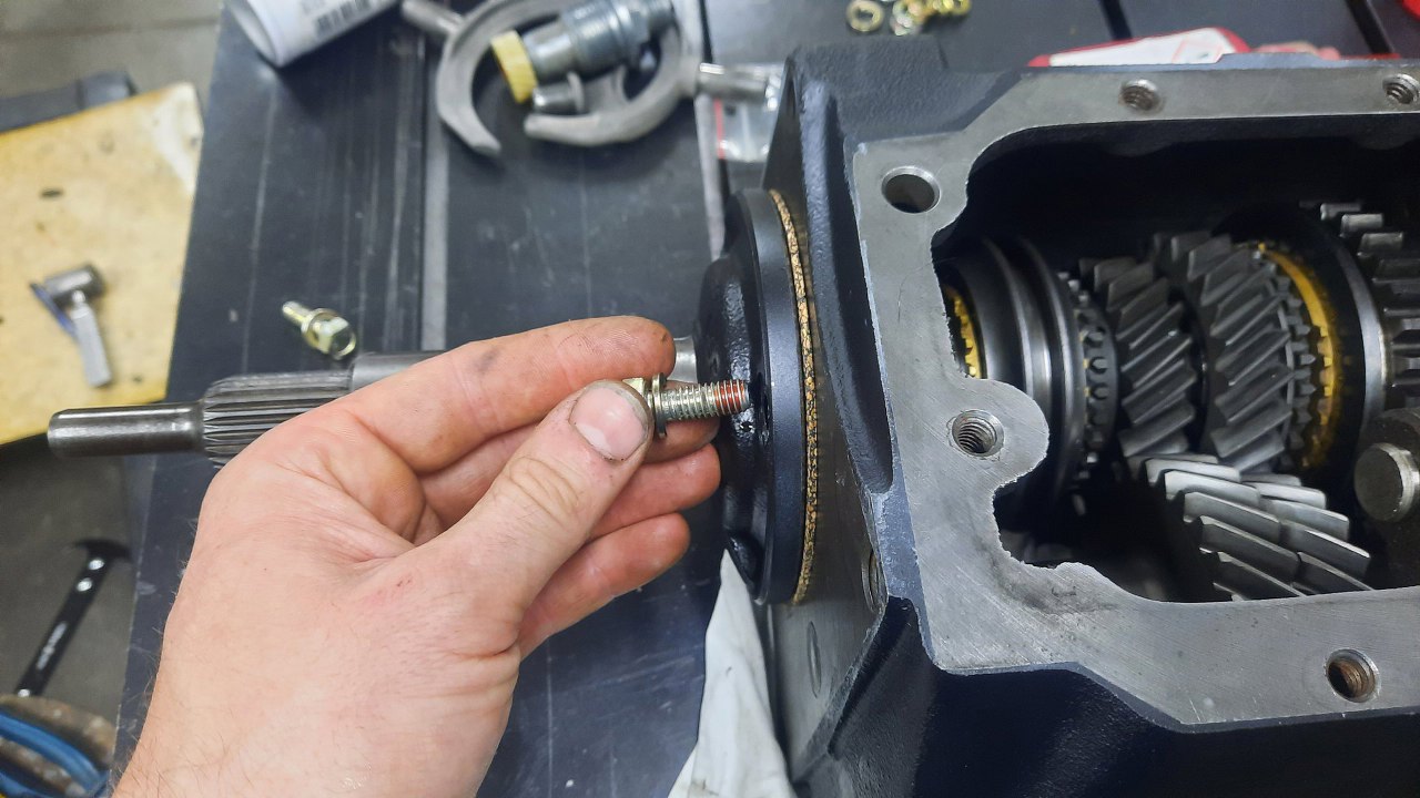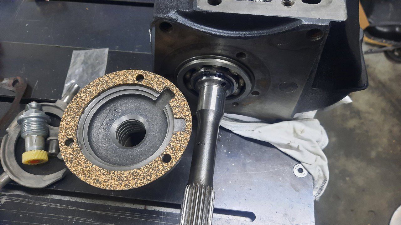 Z przodu lekko przykręciłem ryjek skrzyni, żeby wałek sprzęgłowy mi nie wypadał podczas składania reszty. Teraz go odkręciłem, żeby założyć uszczelkę. Widać w środku ryjka, że ta skrzynia nie ma jeszcze tu uszczelniacza, tylko kształt zapobiegający wylewaniu się oleju przodem.