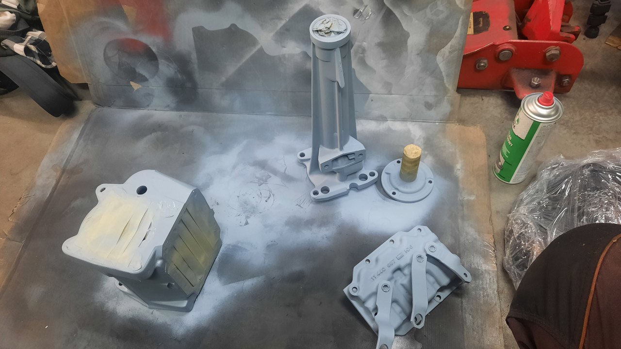 Części obudowy po dokładnym umyciu odtłuściłem, zabezpieczyłem powierzchnie, których nie będę malował i pomalowałem. Tu jeszcze w podkładzie epoksydowym.