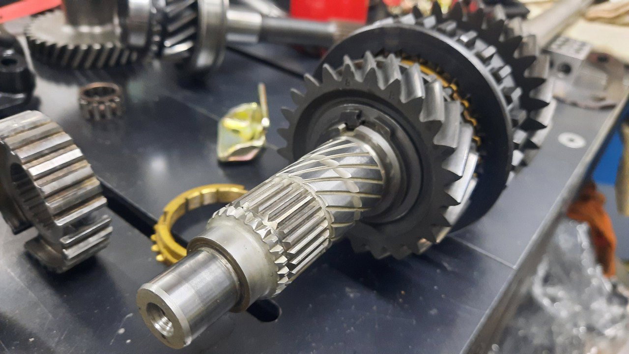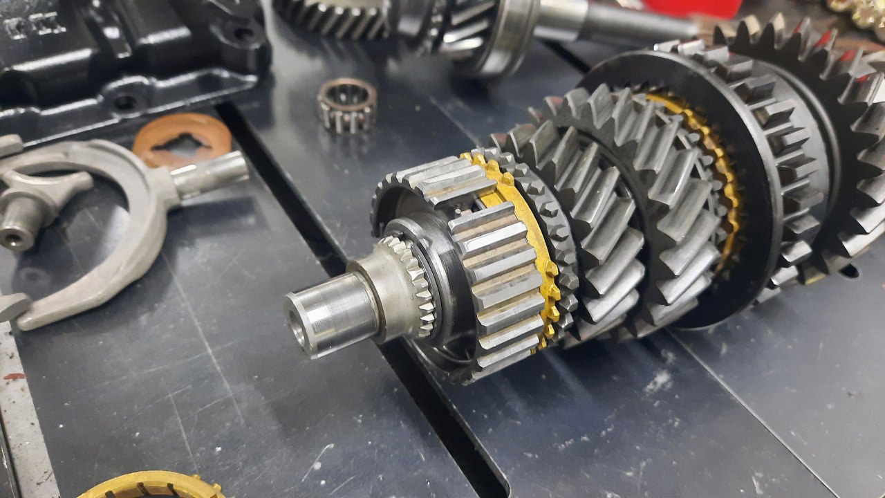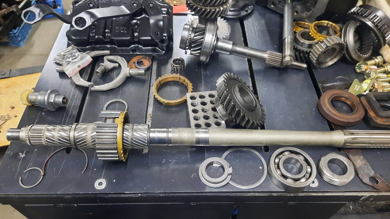 Potem koło zębate wstecznego biegu, będące jednocześnie wybierakiem 1 i 2 biegu, a potem synchronizator 2 biegu. Dalsze koła zębate leżą już przygotowane wyżej.
