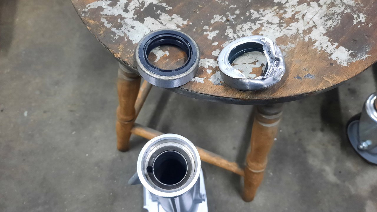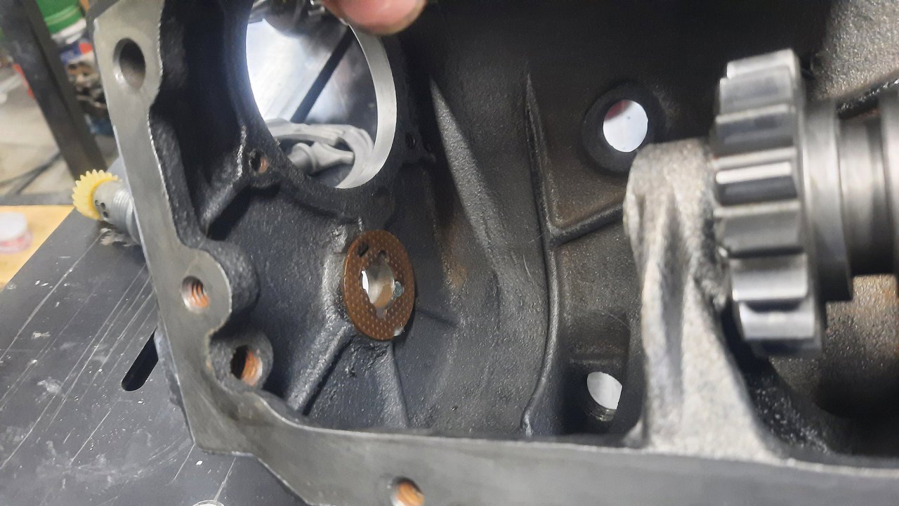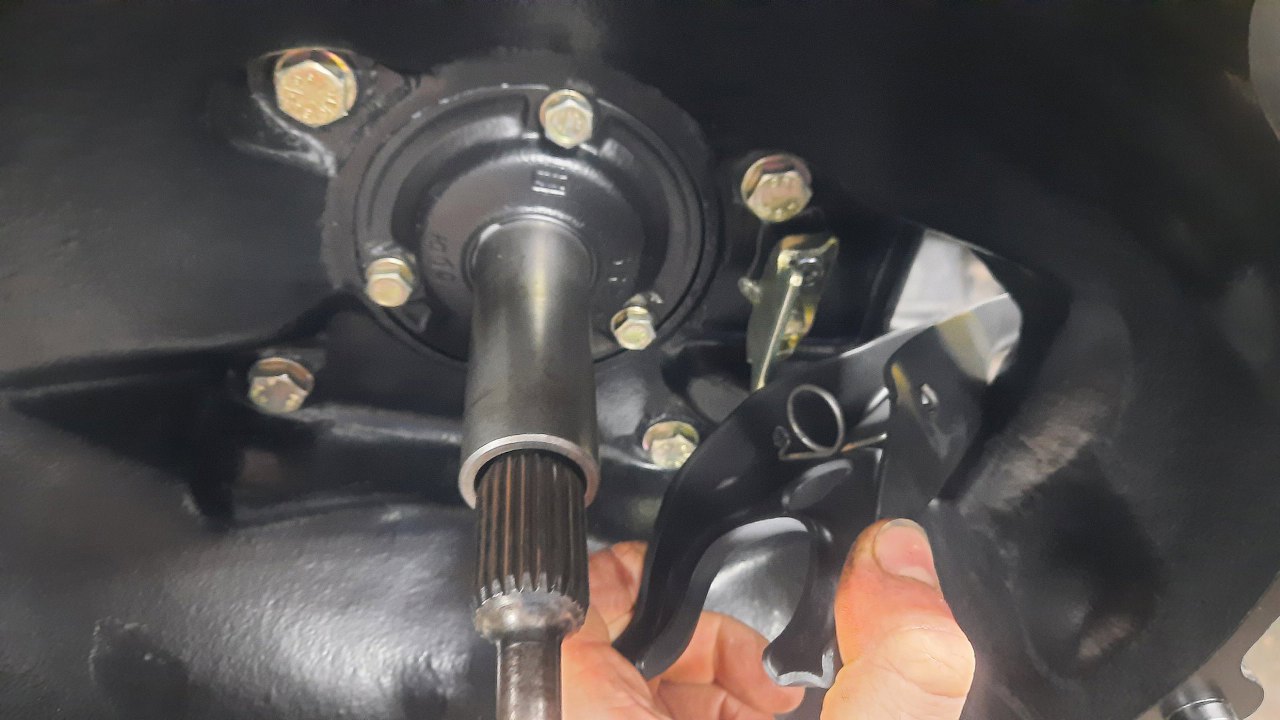 Jak wszystko jest prawidłowo złożone, to ten pierścień ładnie wskakuje na swoje miejsce w ogonie skrzyni i trzyma łożysko tylne, żeby się nie wysunęło do przodu.