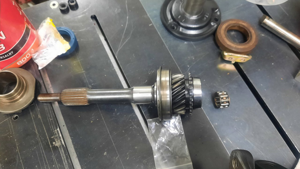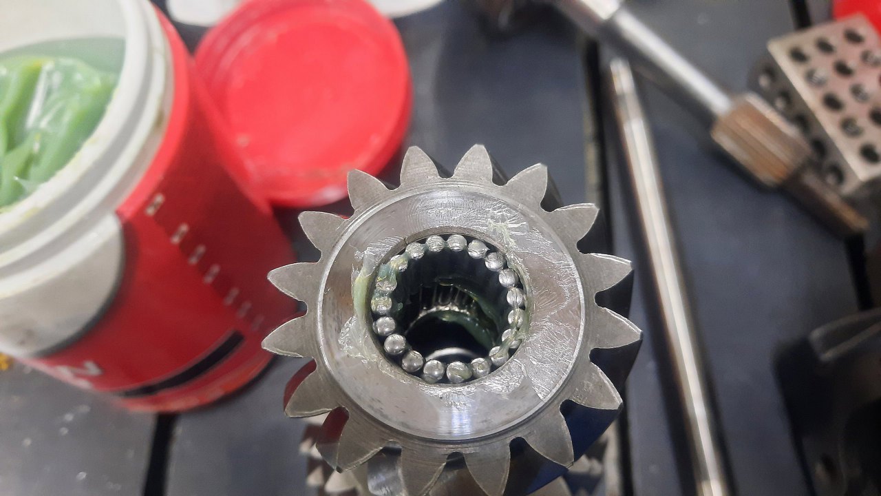 Potem kolejne koła i synchronizatory. Wszystko oczywiście smarowane olejem podczas składania. Na koniec ostatni pierścień sprężysty. Wystająca końcówka prowadzona jest w wałku sprzęgłowym na łożysku wałeczkowym widocznym w tle.
