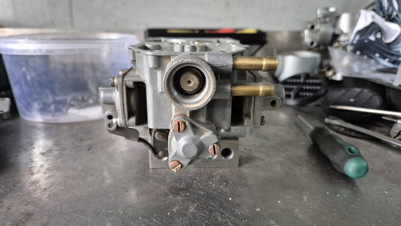Przewracam gaźnik, żeby się dostać do śrub mocujących płytkę z przepustnicami.