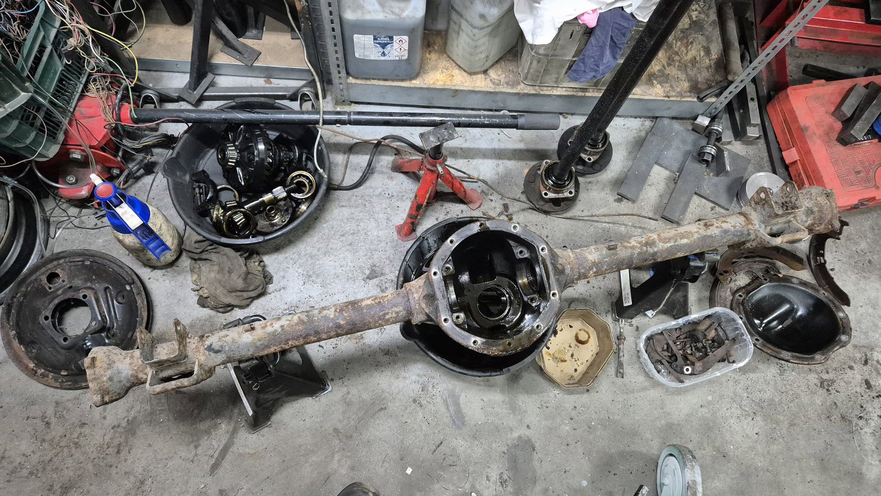 Na koniec wybiłem jeszcze bieżnie łożysk wałka ataku. W międzyczasie wszystko to będzie umyte, zrobię listę zakupów, a obudowę mostu dam do piaskowania. Okazało się też, że mocowania resorów są pogięte, więc po piaskowaniu, a przed malowaniem proszkowym, będzie trzeba się i tym zająć.