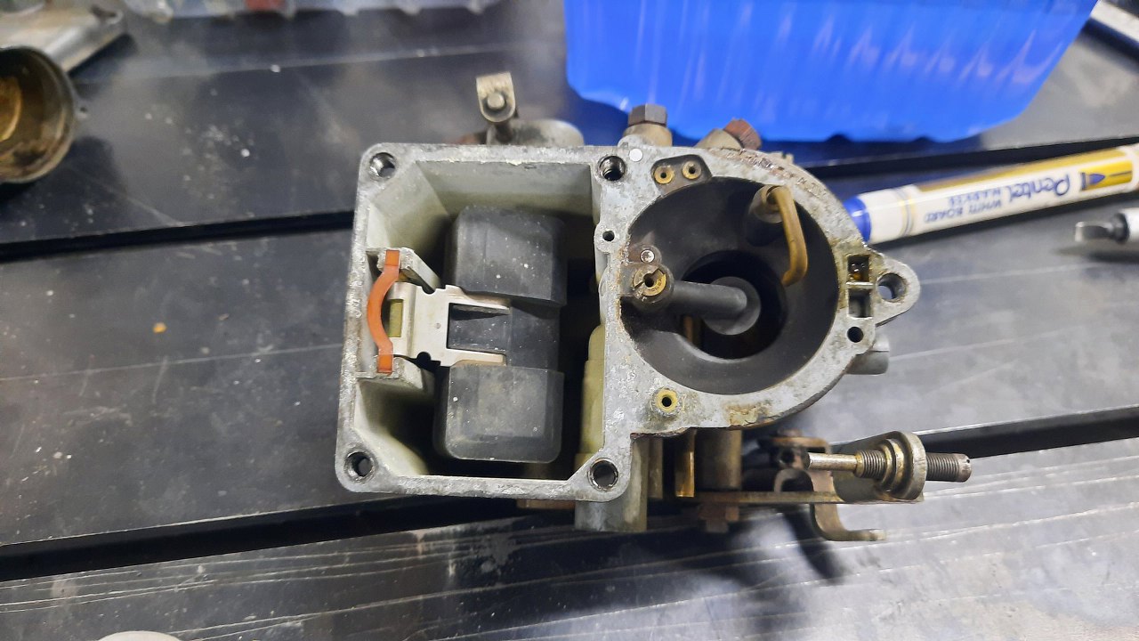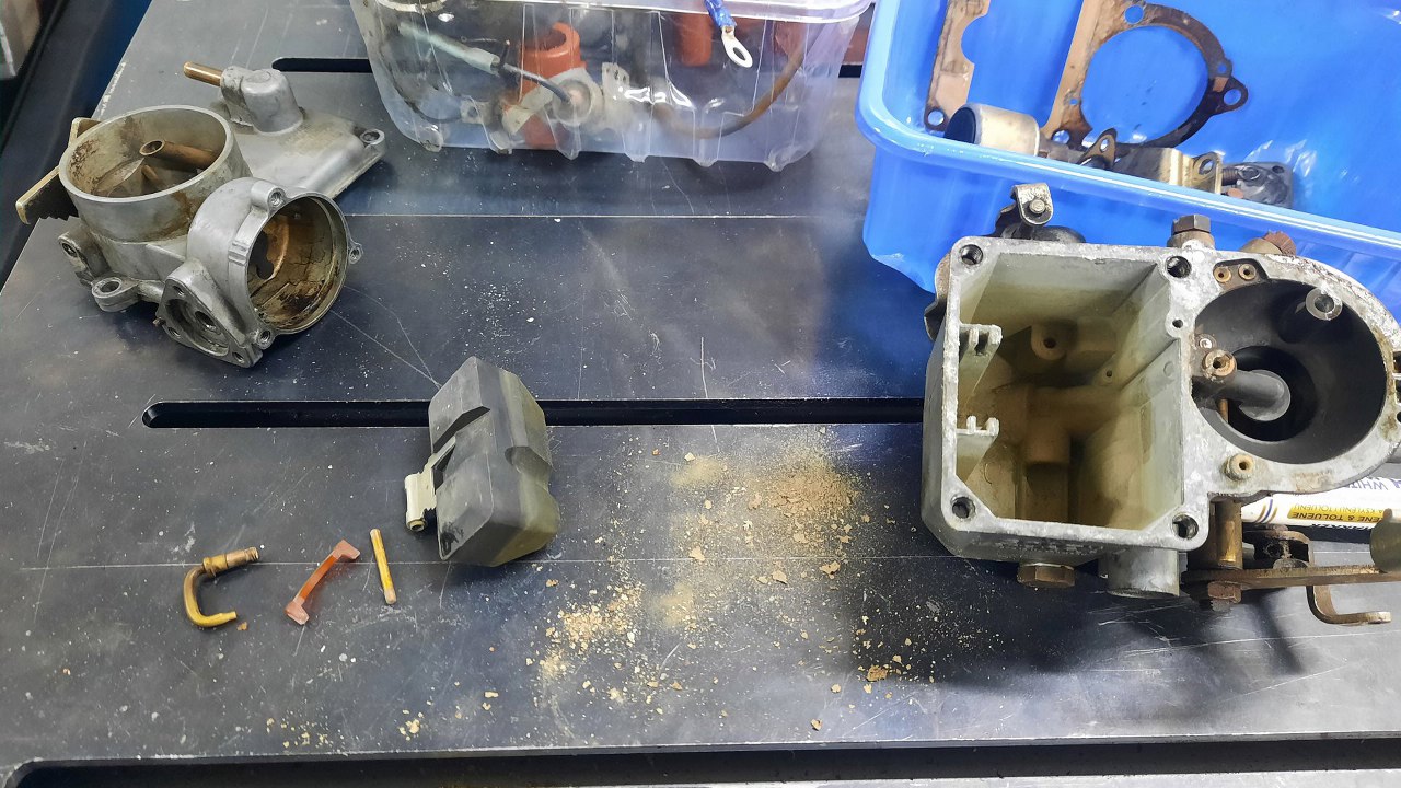 Wyjąłem dyszę pompki przyśpieszacza i pływak. W komorze pływakowej sporo osadu ze starego paliwa.