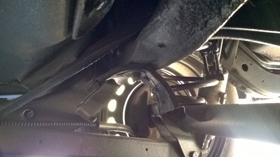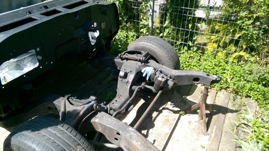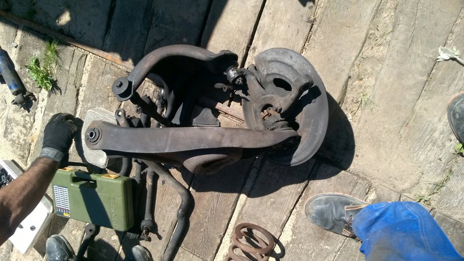 Zanim jednak cokolwiek przykręcimy, to najpierw tzreba kilka rzeczy odkręcić. Na aucie zostały zawieszenia, o których wiedzieliśmy, że są w stanie do zrobienia. Tylne zawieszenie (widoczne częściowo na zdjęciu - ciężko się robi zdjęcia leżąc pod spodem) miało luzy na tulejach, wymagało też ogólnego odświeżenia.