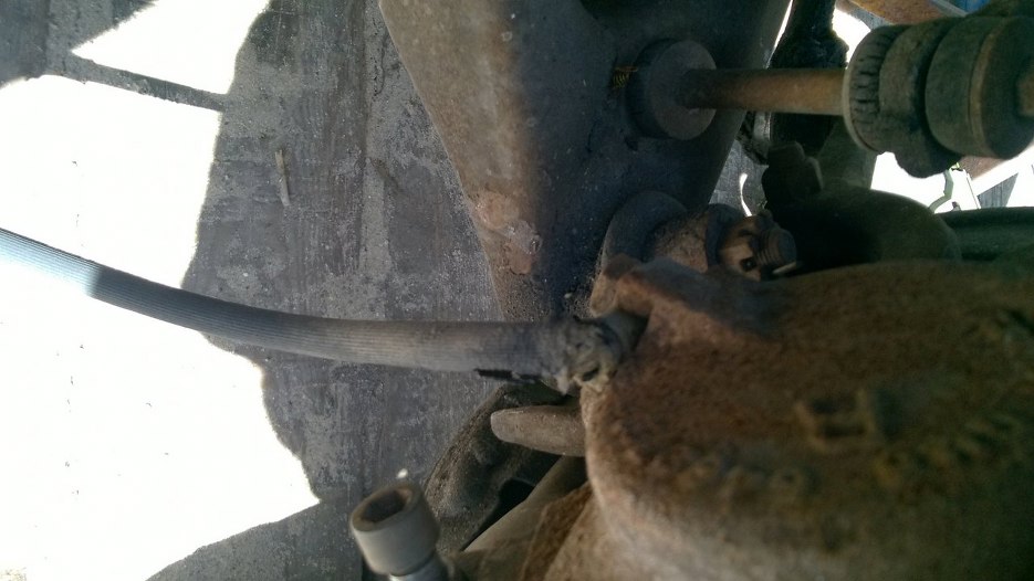Drugi koniec elastycznego przewodu hamulcowego mnie trochę zaskoczył. Dobrze, że go wymieniamy...
