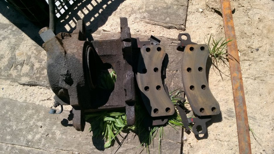 Zdjęty zacisk. Klocki może nie wyglądają, ale są prawie nowe. Też ktoś to niedawno robił. Zaciski, tarcze i klocki najprawdopodobniej zostawimy jak są (podobnie jak tylne szczęki i bębny), bo widać, że prawie nowe są.