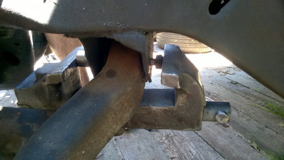 Poległem za to na śrubach dolnych wahaczy. Po długich walkach dwie z nich jakoś wybiłem naparzając młotkiem ile wlezie, ale dwie ani drgnęły. Dopiero prasą się dało je wycisnąć. Niestety samochodu nie dało się włożyć do prasy, bo był za duży i zawadzał, dlatego zamiast prasy użyłem imadła luzem.
