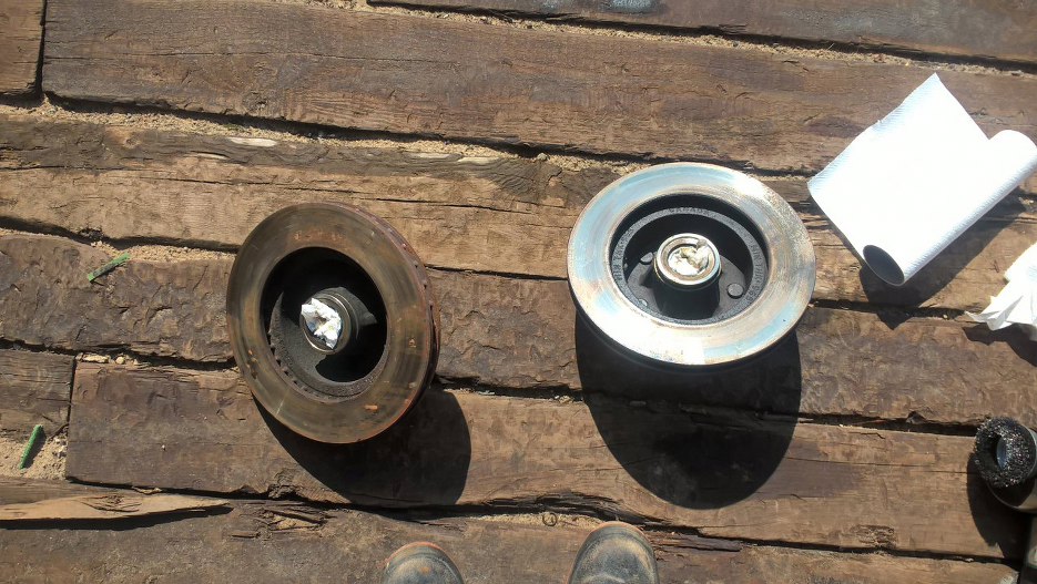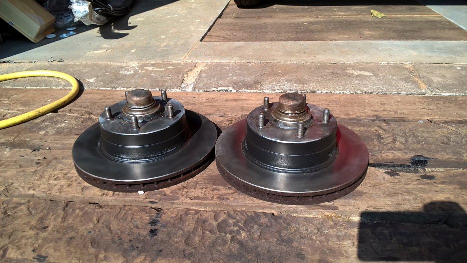 Do postawienia Monte Carlo na koła brakuje jeszcze przednich piast. W tych autach (zresztą w większości Chevroletów od lat '60 do '90 z tego co wiem) tarcza jest jednym kawałkiem z piastą. Tarcze są w dobrym stanie, więc nie będziemy ich wymieniać. Oczyściłem wszystko druciakiem na szlifierce, zabezpieczając łożyska przed pyłem.