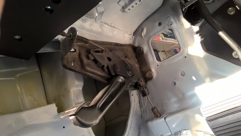 Mechanizm hamulca awaryjnego jest zakuty, więc ciężko go rozłożyć do odnowienia, ale został odrdzewiony. Tylko ta część, która jest widoczna spod tapicerki została pomalowana.