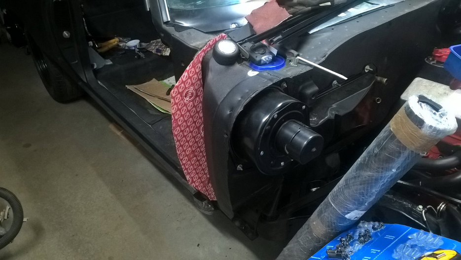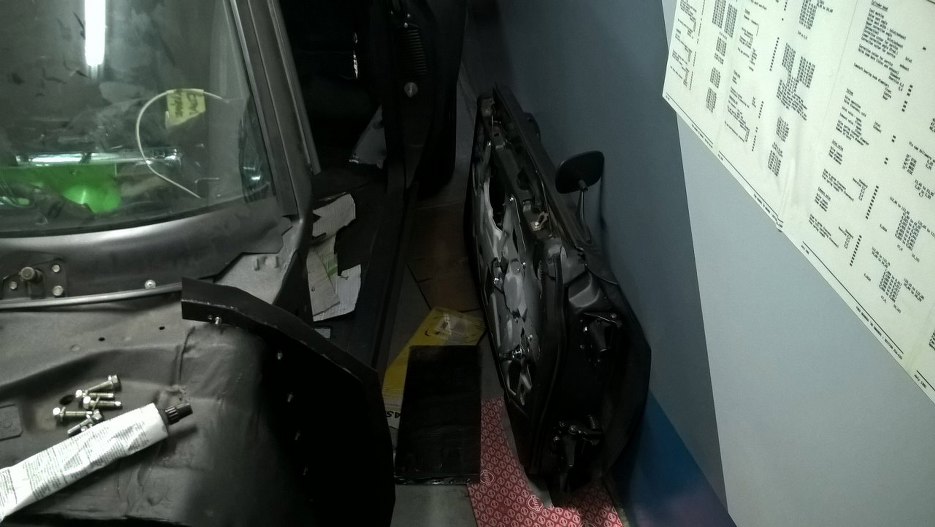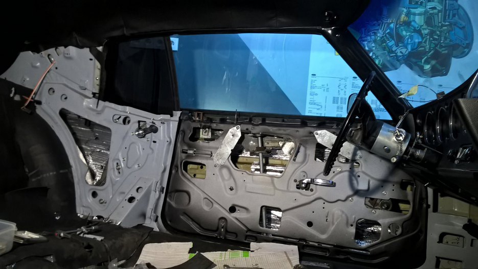 Teraz nie było łatwo - trzeba to przykręcić do karoserii. Od przodu nie było miejsca, żeby podejść z wiertarką. Z prawej strony nie było to dużym problemem, bo drzwi jeszcze tam nie ma, ale po stronie kierowcy musiałem się poddać i zdjąć drzwi...