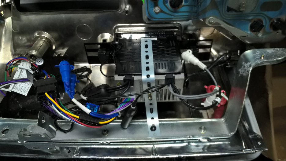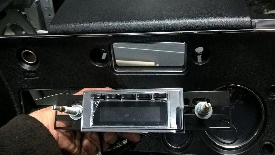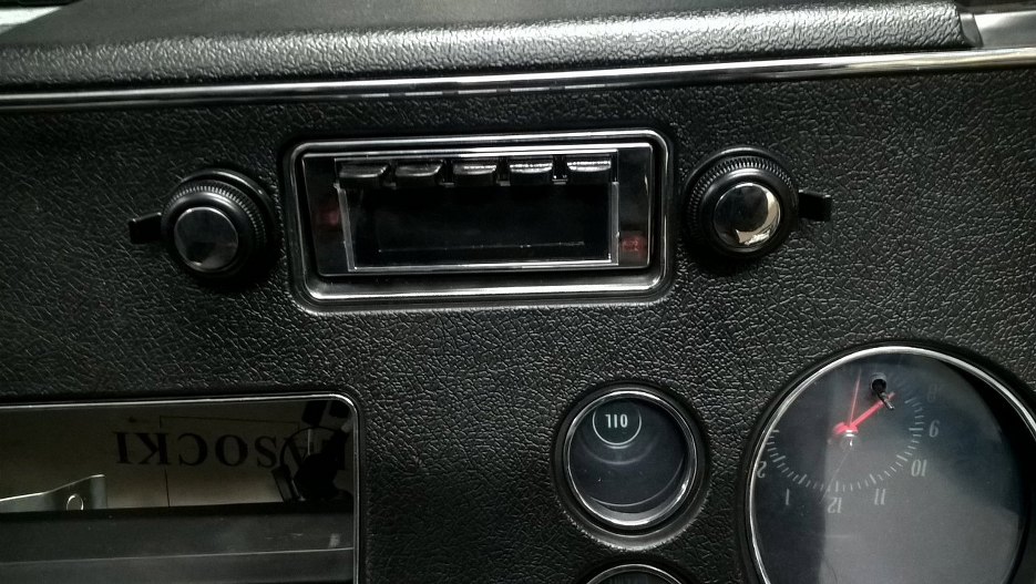 A teraz coś z zupełnie innej beczki - radio. Orygnalnego radia nie było, deska była w tym miejscu wycięta. Wspominałem już, że Grzesiek kupił nową. Nowe radio to RetroSound, udaje z wyglądu stare, ale ma wszystko w środku nowe. Problem początkowo był taki, że nie pasowało do deski, ale na szczęście udało się kupić od producenta odpowiedni adapter.