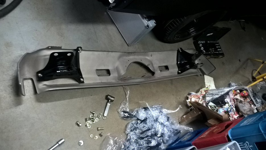 Po chwili udało się przykręcić zderzak. Ze złych wiadomości jest to, że cztery śruby urwały się w karoserii podczas jego odkręcania przed remontem i ktoś będzie musiał je odwiercić. Jak ja temu komuś współczuję, wiercić śruby fi 10 od dołu... bo to będę ja...