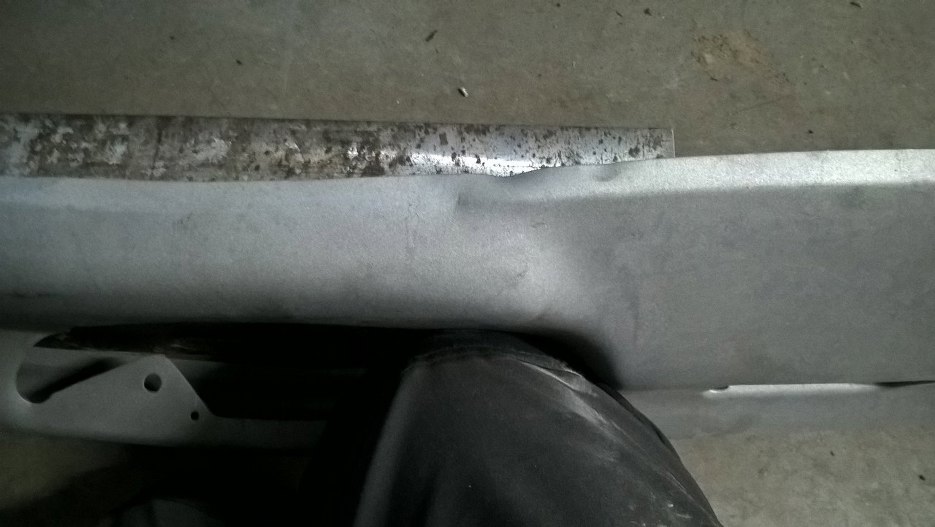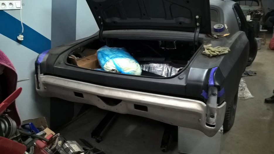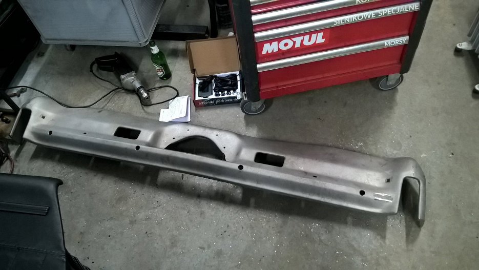 Zderzak tylny (jak i przedni, co za zbieg okoliczności) był oryginalnie chromowany, ale Grzesiek stwierdził, że za mało ocieka mrokiem, grozą i czarną lukrecją, dlatego będzie czarny. Cały chrom został wypiaskowany (podobno po wypiaskowaniu dwóch zderzaków pracownik w piaskarni rzucił robotę, tki solidny chrom był), ale zanim będzie można pomalować zderzak, musimy go podprostować. Na razie przykręciłem mocowania.