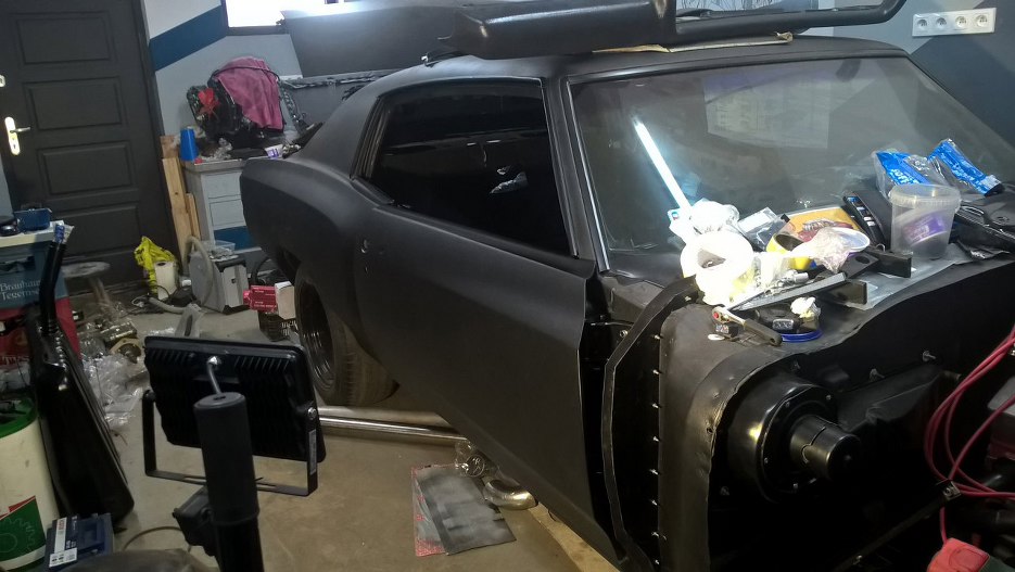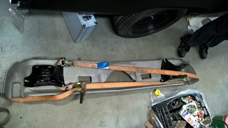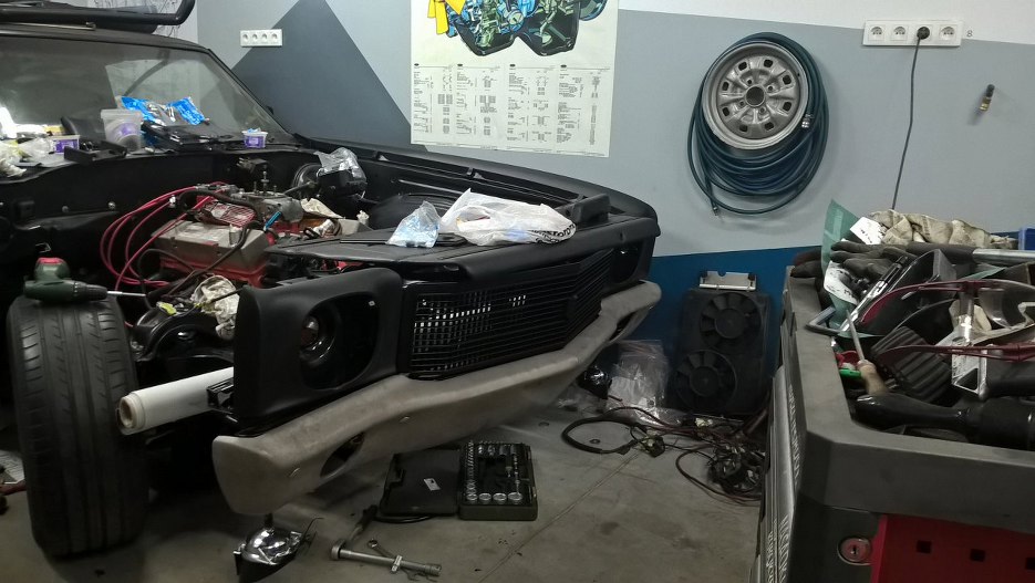 Do przymiarek przykręciliśmy też przedni zderzak. Podobnie jak tylny, też został pozbawiony chromu. Wiedzieliśmy, że jest bardziej krzywy niż ten tylny. Lewą stronę udało mi się wygiąć prawie do stanu idealnego podnosząc za niego podnośnikiem całe auto i skacząc po ramie :). Prawa strona zderzaka widać jak jest krzywo, ale z prostowaniem jej poczekam aż będzie przykręcony prawy błotnik, bo przód auta nie jest jeszcze porządnie skręcony i może też nieco pójść do dołu w stronę zderzaka.