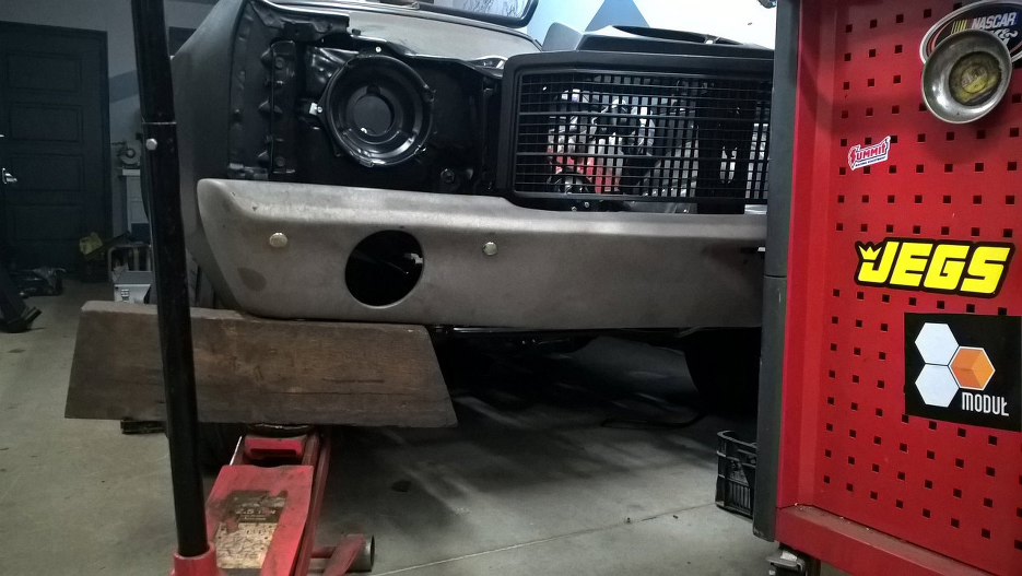 Wielka chwila - przymiarka zderzaka przedniego. Złożyłem większość paneli przednich, żeby sprawdzić jak to wszystko do siebie pasuje. Większość pasowała, zderzak... nie bardzo. Stronę kierowcy udało mi się wyprostować podnosząc podnośnikiem, spróbuję teraz zrobić to samo ze stroną pasażera. Tu widać belkę drewnianą pod zderzakiem. Podnoszę w ten sposób cały samochód. Zderzak trzeba wygiąć do góry o jakieś 5 centymetrów, czyli dość sporo. To chwilę zajmie...