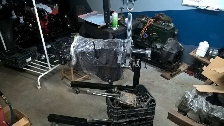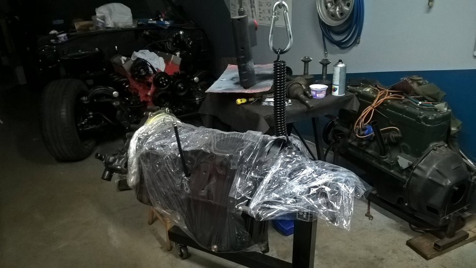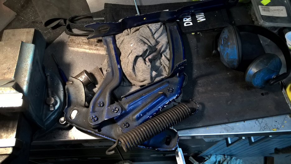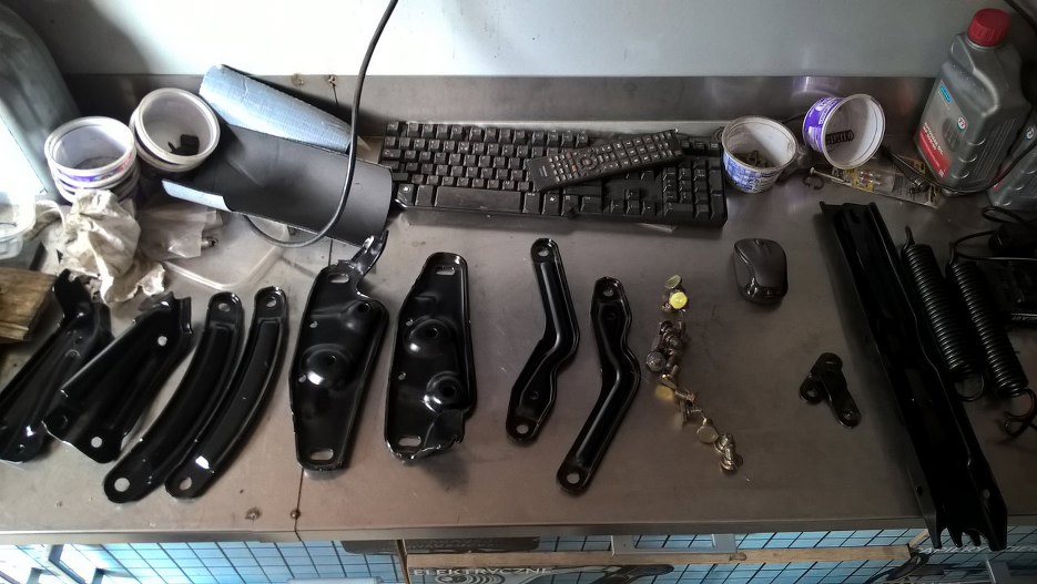 Poszczególne części zawiasów zostały pomalowane proszkowo. Jedynie ze sprężynami musiałem coś wymyślić, żeby były pomalowane nie tylko z wierzchu, ale i pomiędzy zwojami. Wziąłem cokolwiek ciężkiego, co było pod ręką - akurat był to silnik - i wyciągarką rozciągnąłem sprężynę o niego zaczepioną. Dzięki temu miałem dostęp do zakamarków sprężyn i pomalowałem je podkładem.
