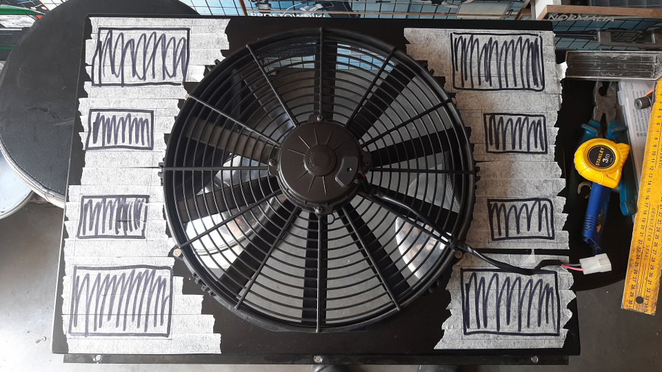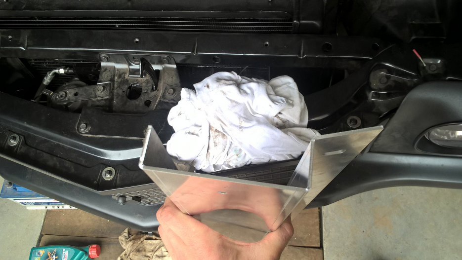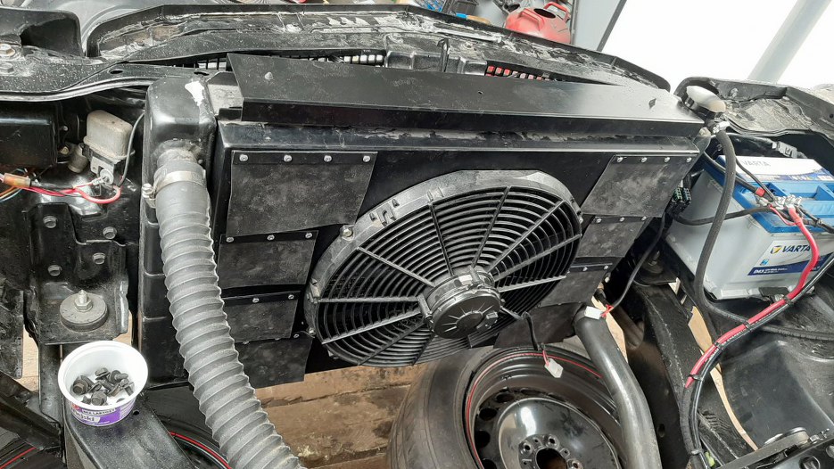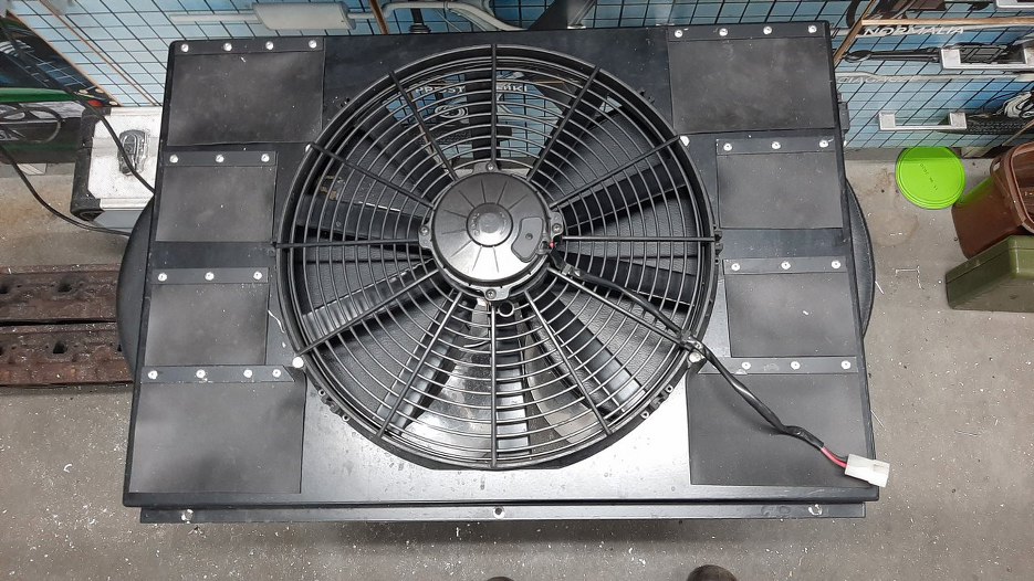 Całość połączyłem nitami. Teraz powietrze swobodnie przeleci przez chłodnicę podczas jazdy, ale przy włączonym wiatraku nie wejdzie przez te otwory, bo zamkną je gumowe zastawki.