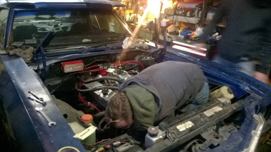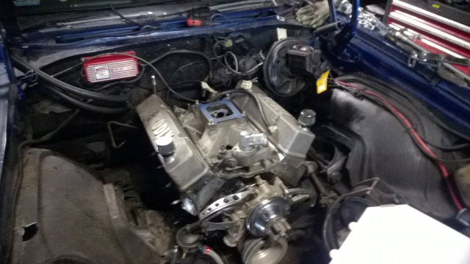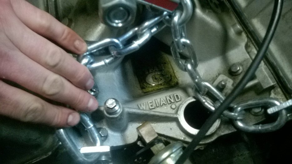 Rozrząd też widać, że aftermarket, dość ciekawy zresztą. Pokrywa rozrządu też jest aluminiowa, więc coś czuję, że wałek standardowy nie jest. DO tego gaźnik (dość sporawy) Demon, parę dziwnych rzeczy w osprzęcie, układ zapłonowy (aparat i elektronika) MSD... Całość przyprawiona faktem, że wszystkie śruby są ARPa, ale za to kilku brakuje. Na przykład tych trzymających łapy silnika do bloku :)