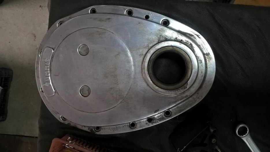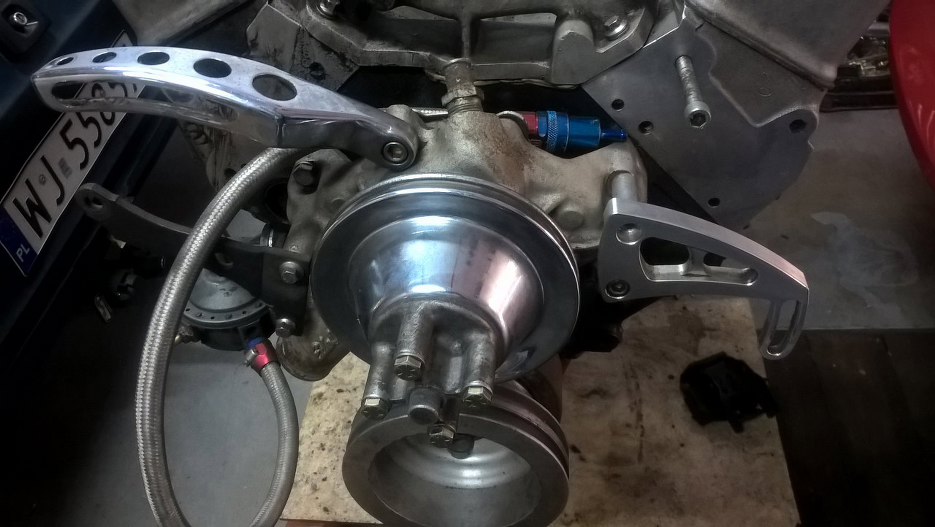 Błyskotki odkręcone. Co ciekawe koło pasowe pompy wody jest lekko krzywe. Nowa pompa wody Edelbrocka.