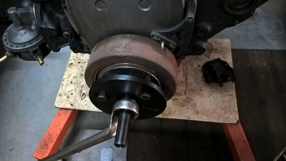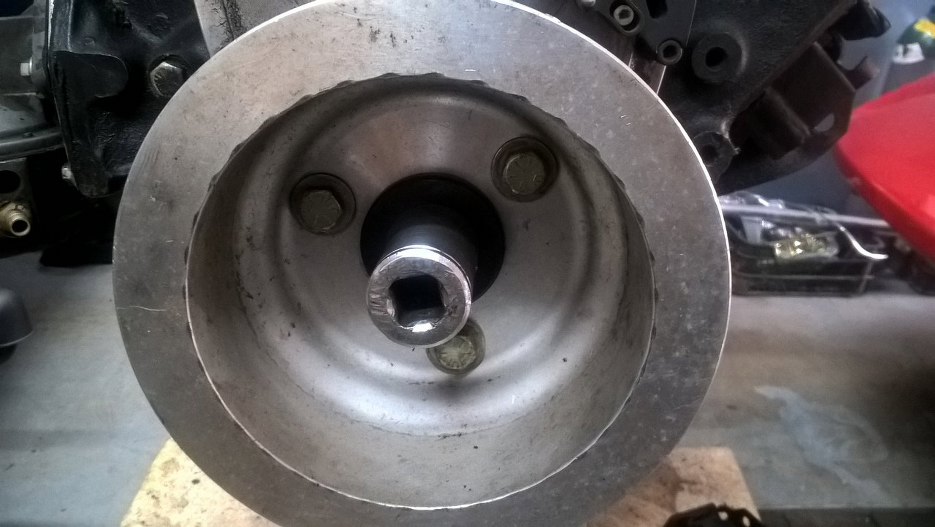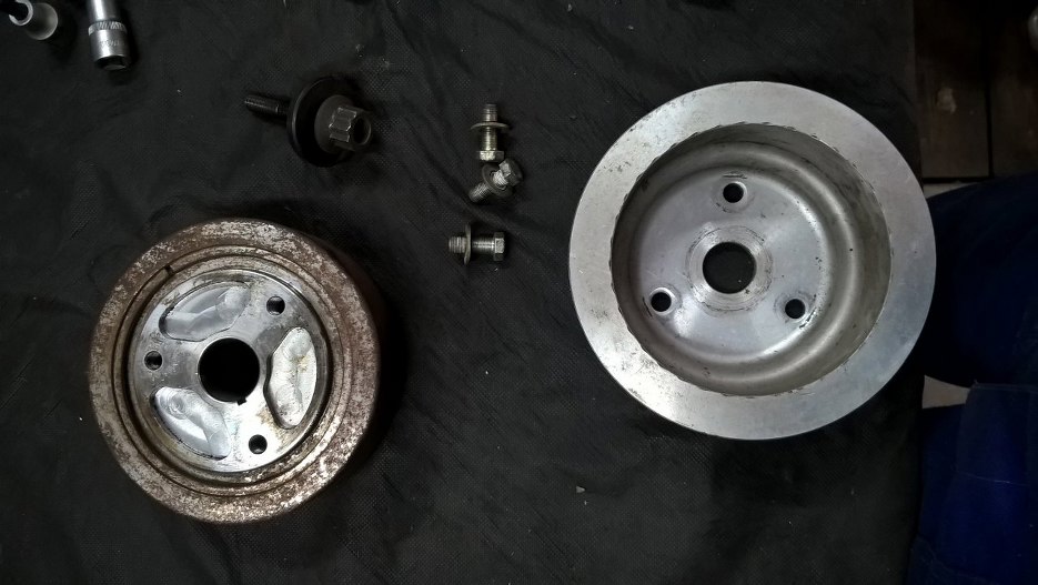 Po odkręceniu również pozostałych trzech śrub ze zdjęcia powyżej założyłem ściągacz i odkręciłem tłumik drgań harmonicznych (harmonic balancer).