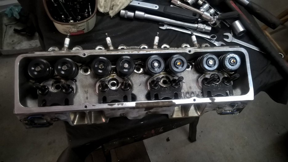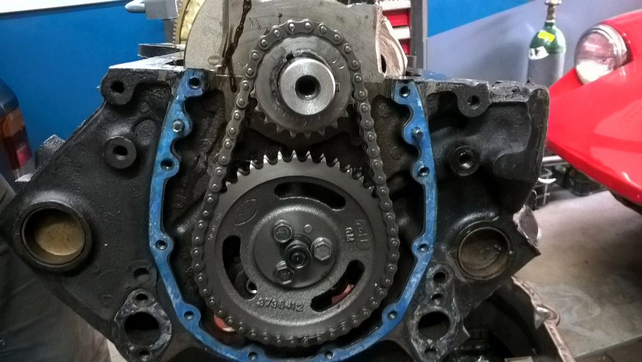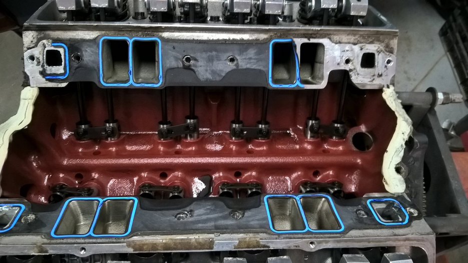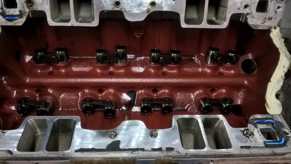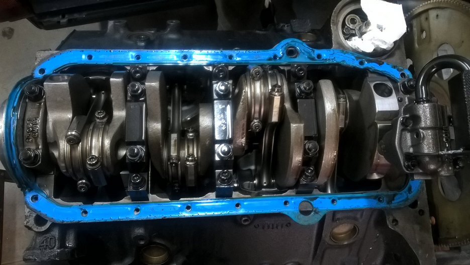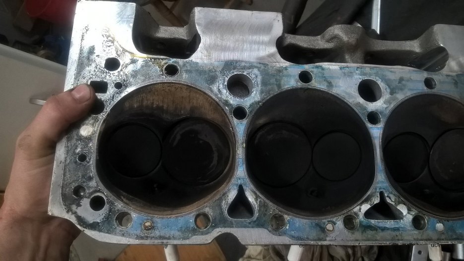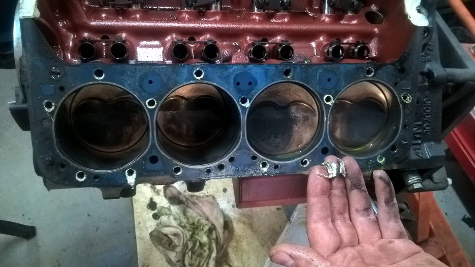 Śruby wkręcane na uszczelniacz do gwintów (w SBC otwory na śruby głowicy są na wylot do płaszcza wodnego), ale jest go nieco za dużo jak na mój gust :). Inna sprawa, że tłoki wyglądają na drogie. Na cylindrach ślady honowania i mało nagaru. Silnik wygląda na dość świeżo poskładany.
