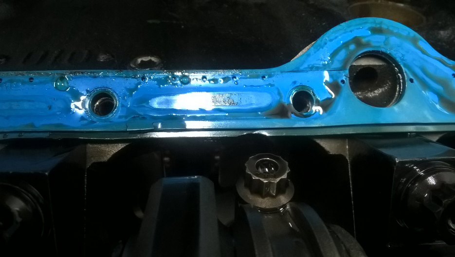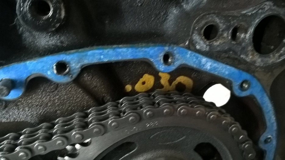 Wiedziony ciekawością zmierzyłem skok tłoka - nie jest taki jak powinien być. Zgodnie z oczekiwaniami jest tu włożony wał o większym niż standardowy skoku, czyli stroker kit. Większy skok powoduje zawadzanie śrub korbowodów o płaszczyznę bloku, do której przykręca się miskę olejową, dlatego są tam zrobione specjalne podcięcia. Sęk w tym że uszczelka nie miała podcięć i w jednym miejscu widać jej wyszczerbiebie :)