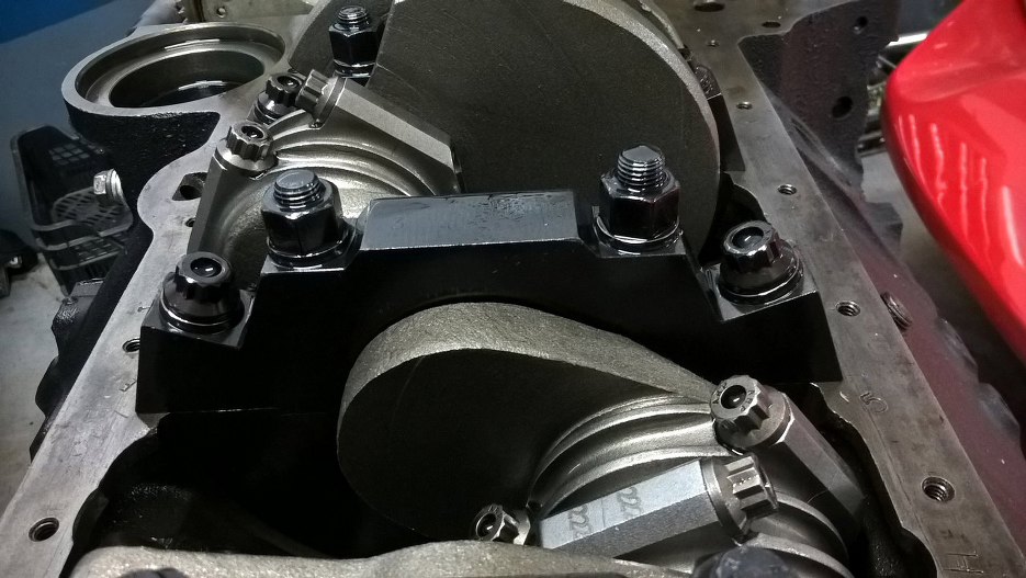 Stopy wału są też nieoryginalne, i nie dość, że przykręcane na cztery śruby, to jeszcze zewnętrzne śruby są pod kątem. Układ korbowy w tym silniku może znieść bardzo dużo.
