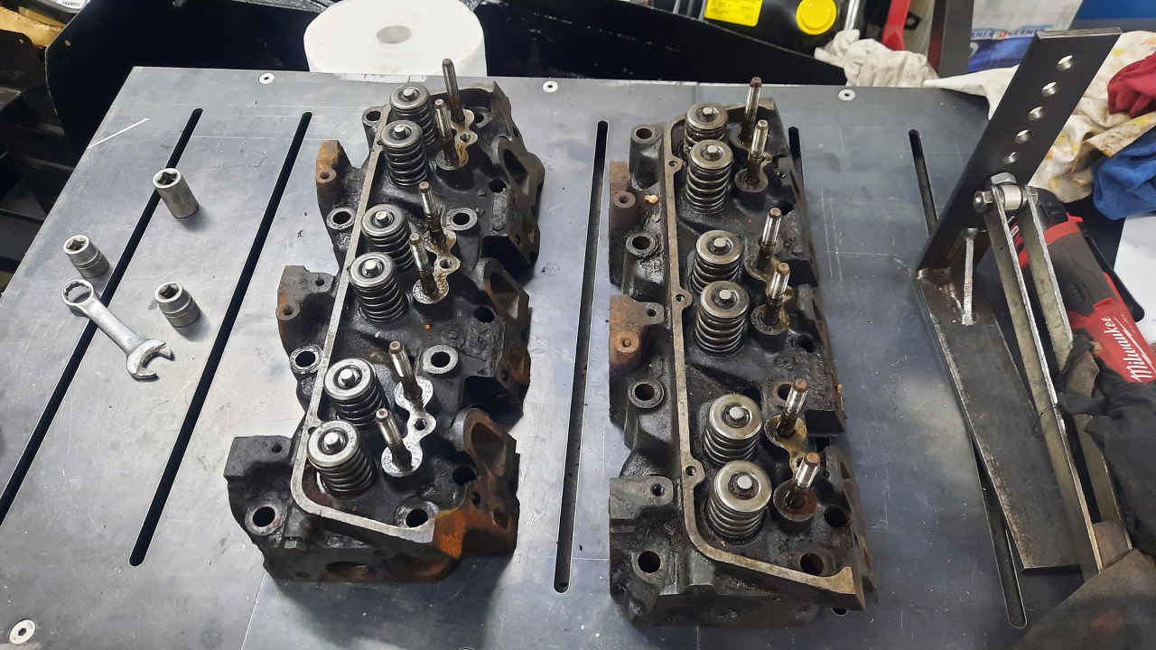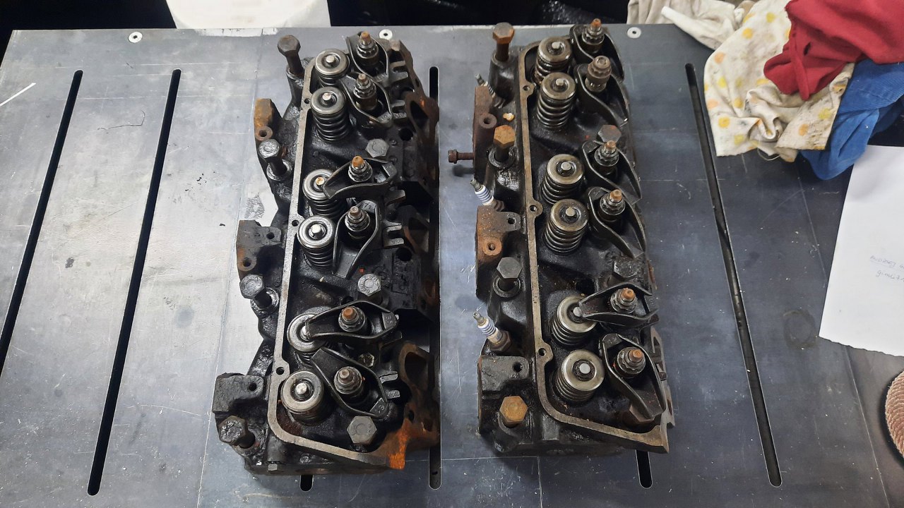 Ponieważ silnik Essex jest konstrukcyjnie blokiem żeliwa z kilkoma tylko otworami na tłoki i inne drobiazgi, to waży kilka ton. Dlatego Piotr przywiózł go od razu w kawałkach. Szybki rzut oka na głowice...