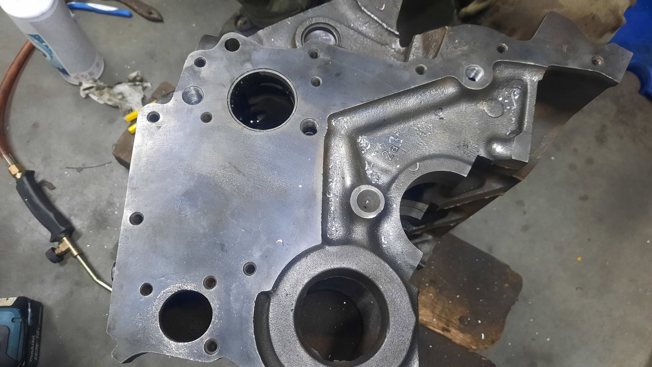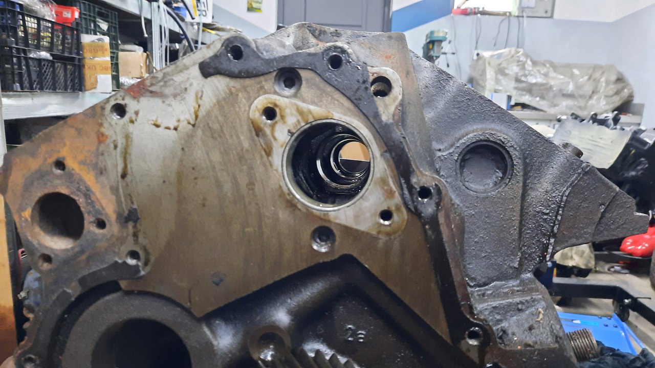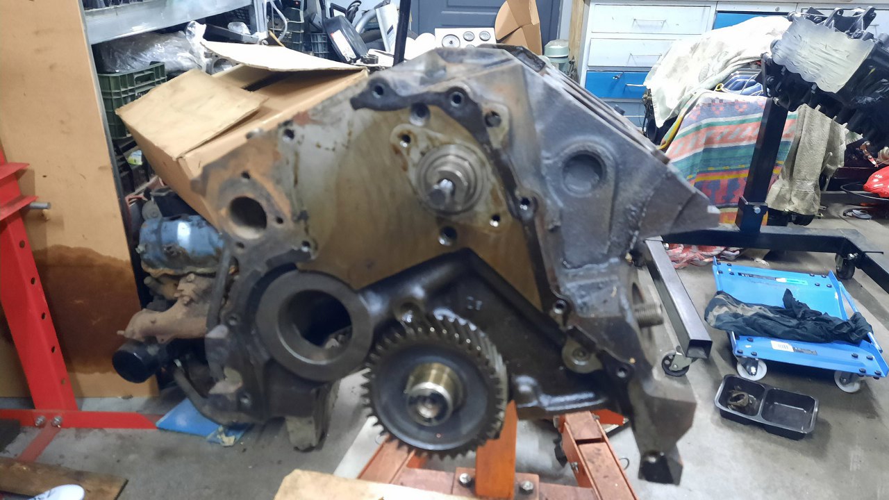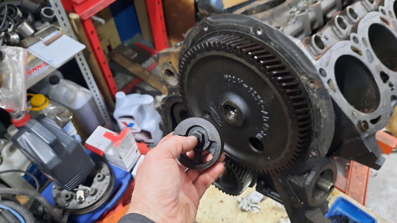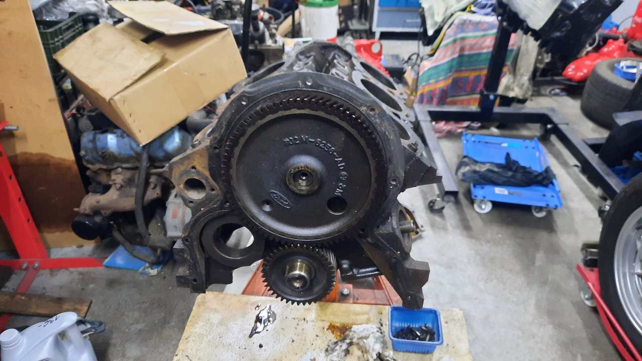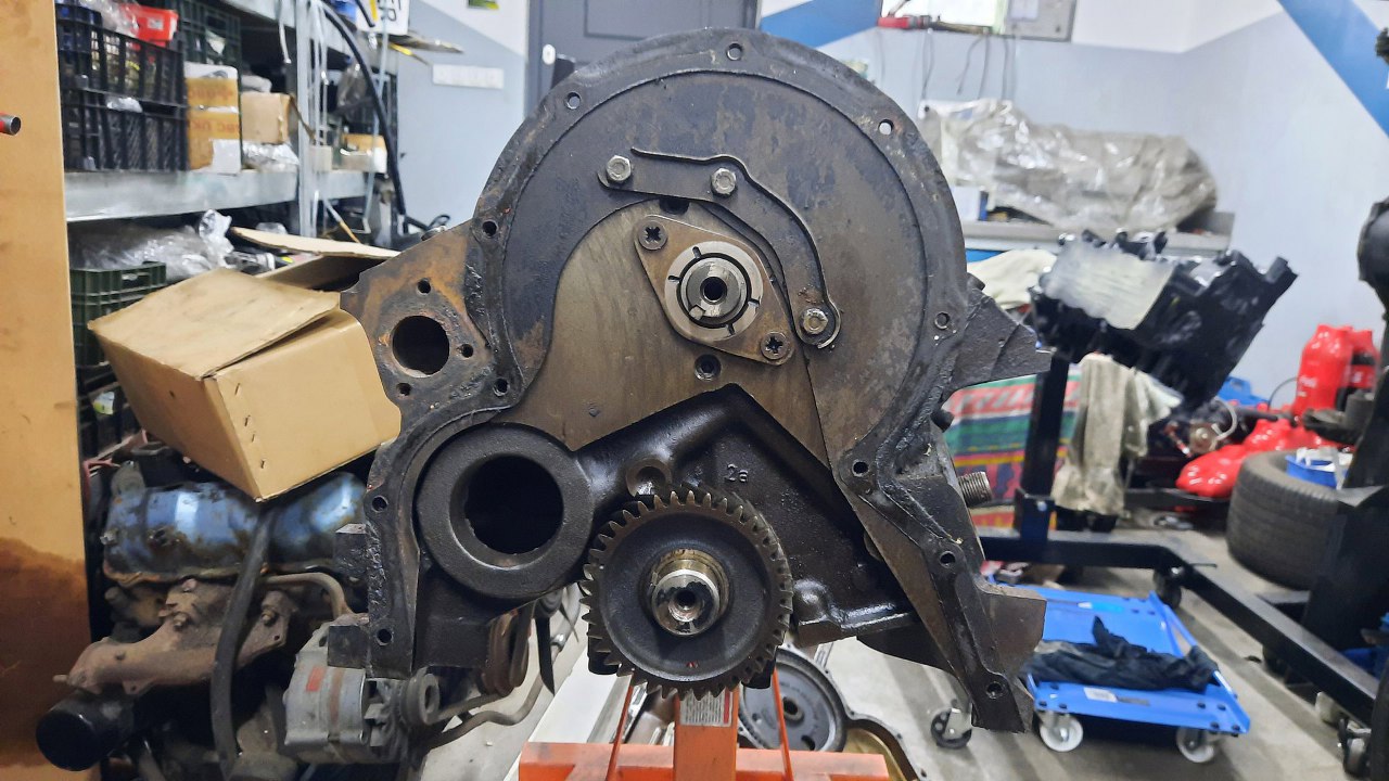 Po zdjęciu pokrywy rozrządu widać klasyczne koła zębate, dość typowe dla Forda z tamtych lat. Tyle, że w tym silniku są oczywiście cholernie masywne. Otwór w bloku po lewej to miejsce na wałek wyrównoważający - były też te silniki w wersji V4 (dwulitrowe), tam był wykorzystywany.